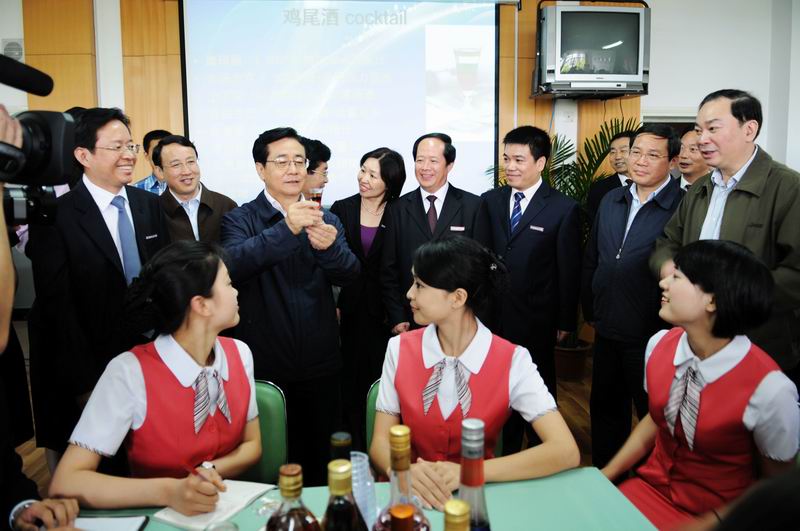 赵洪祝一行走进空中乘务实训中心,当看到学生们正在上实训课调制鸡尾酒时,被色泽晶莹的杯中物吸引了,驻足观看,饶有兴趣地听取民航旅游分院院长赵淑桐的介绍,并兴致勃勃地品尝了学生现场调制的鸡尾酒,对学生的“手艺”连声称赞。随后赵洪祝一行又走进模拟机舱“育英号”,参观了机舱内的情境教学。当听说育英学院空中乘务专业开办已近10年,已有200多名学子飞上蓝天时,赵洪祝高兴地说,下次乘机,先问问服务员是否育英毕业的,希望育英学子飞天的越来越多。