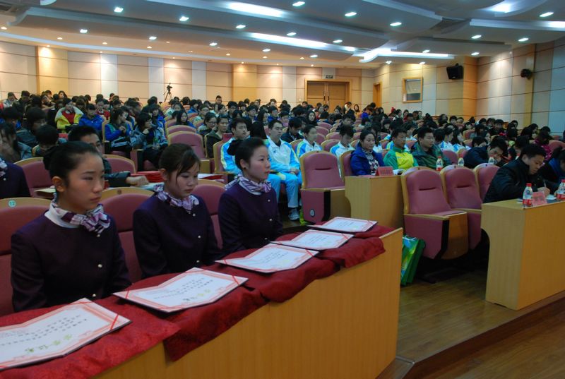 12月15日,学院在学术报告厅召开学生表彰大会,隆重表彰学院第八届全国残运会及第二届世界休闲博览会志愿者,表彰自今年10月以来,在各种赛事中取得优异成绩的学生和指导教师,以及2011—2012学年第一学期“育英之星”。150余名学生、30余名教师受到表彰。