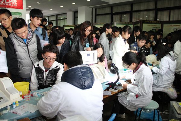 上午11时,三辆采血车驶入育英,一切工作准备就绪。活动一开始,我们就立即感受到现场洋溢的热情,很多同学都在询问献血的相关事项和应该注意的问题。体检的队伍用人山人海来形容一点都不过分。这种热情对于有过献血经历的学长,是坦然与从容;而对于进校不久的大一新生,更多的是紧张与兴奋。现场气氛轻松而愉快,在这个感恩节,同学们完成了这一奉献爱心、感恩社会的光荣之举。