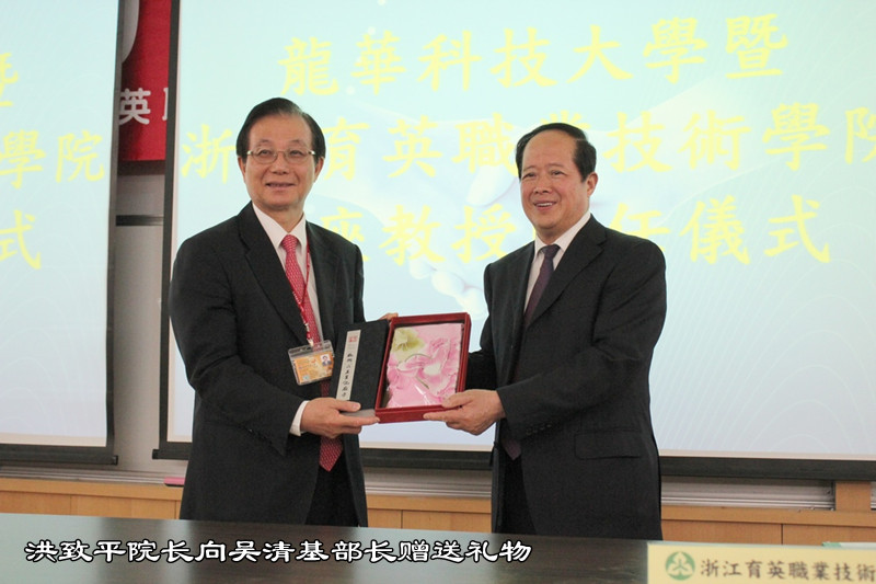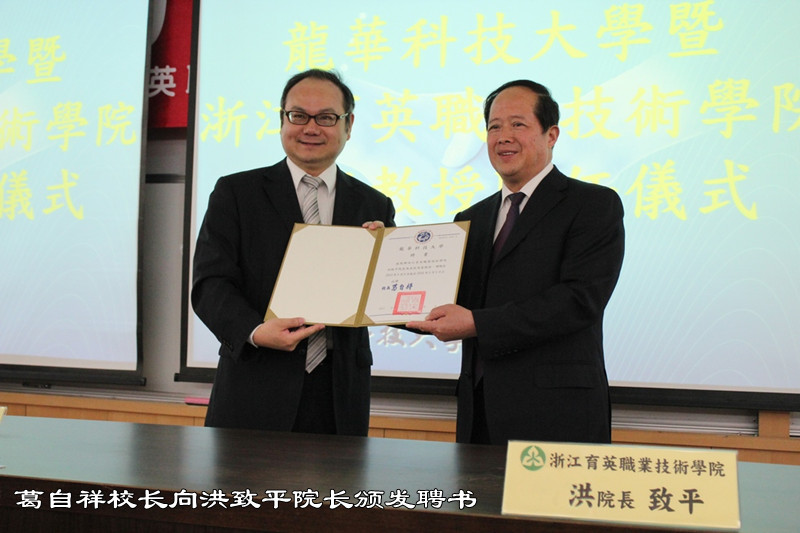 随后,进行了两校客座教授的互聘仪式,洪致平院长和葛自祥校长分别被台湾龙华科技大学和浙江育英职业技术学院聘请为客座教授。