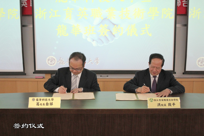 在开班典礼后,葛自祥校长与洪致平院长共同签署了台湾龙华科技大学与浙江育英职业技术学院共同举办文化创意“龙华班”合作协定,浙江育英职业技术学院与龙华科技大学师资培训合作计划合约书,浙江育英职业技术学院与龙华科技大学学生夏令营培训实施协议书,浙江育英职业技术学院与龙华科技大学交流生(研习)实施协议书。