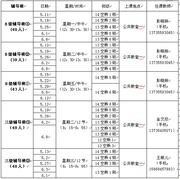 今年六月份的大学英语等级考试时间为6月13日和14日,为帮助同学们能顺利通过考试,特安排考前辅导课,由于考试的人数较多,B级辅导分3班,三级辅导2班。参加四级的同学共4人,请在课余时间找金文欣教师(手机:13735405071)进行辅导,参加六级和A级的同学共2人,请在课余时间找王敏儿教师(手机:15868457883)进行辅导。要求参加考试的同学都要参加辅导课,并能够认真学习迎接考试。授课教师和班主任要严格考勤,督促学生认真复习。分班情况与上课安排,具体如下: