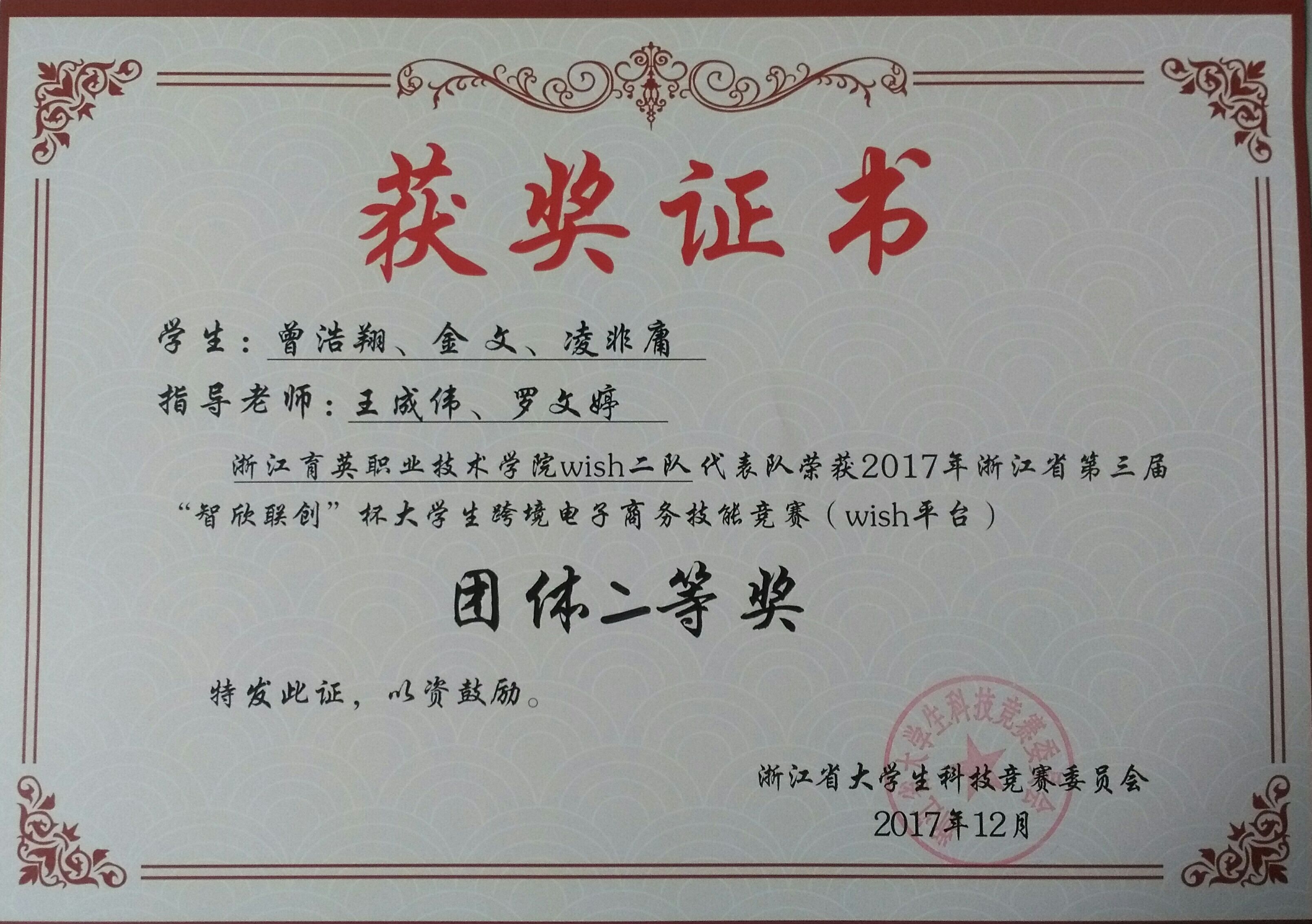 来自全省22所高职院校的89支队伍,参加速卖通、wish和敦煌三个平台的比赛,其中28支队伍脱颖而出,会师总决赛。浙江育英职业技术学院商务贸易分院国贸专业学生曾浩翔、金文、凌非庸组成的wish 2 队闯入决赛,并最终获得Wish平台团体二等奖和精英挑战赛三等奖。