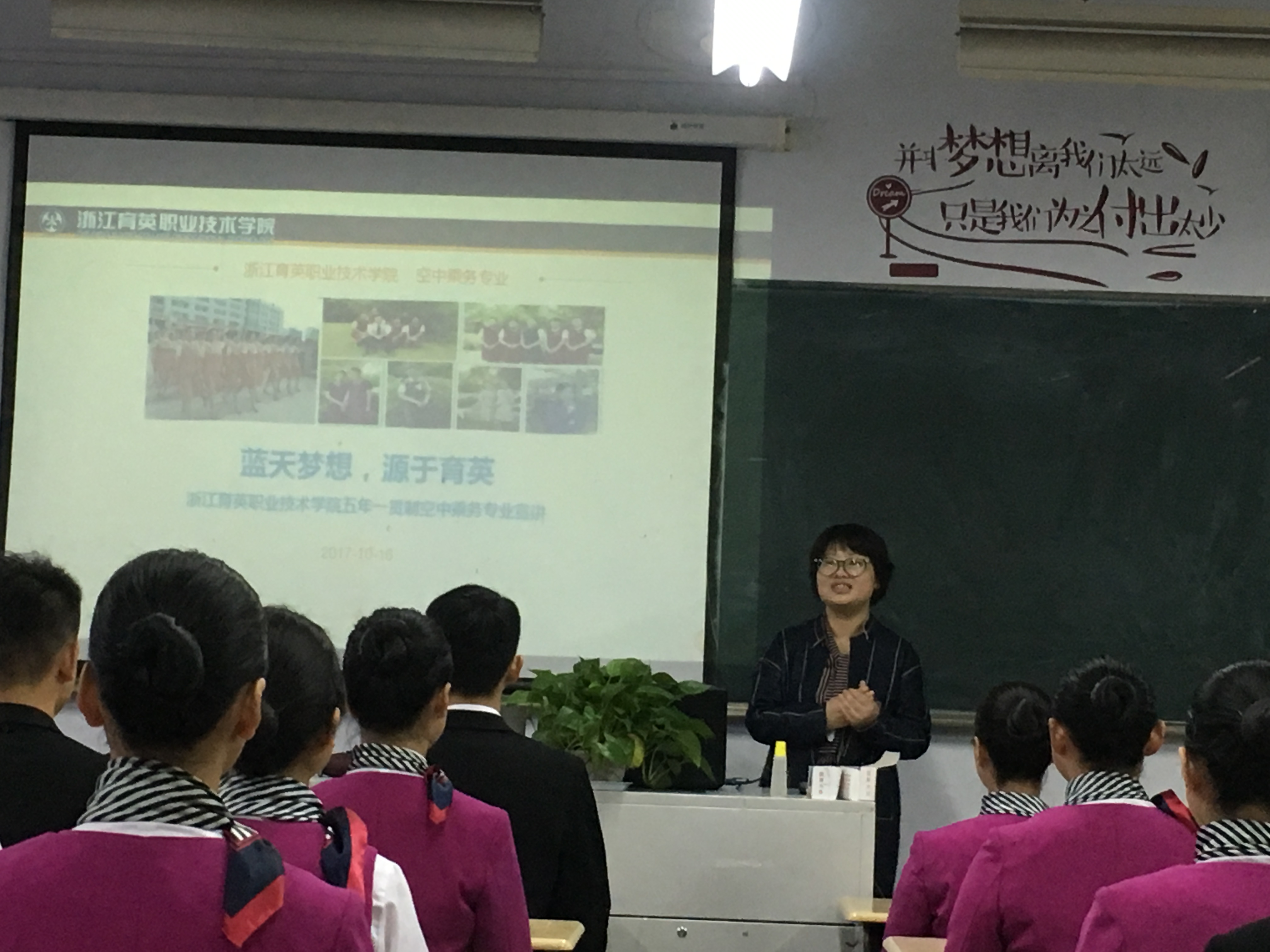 在两天的走访中,我们首先为同学们带去了精彩的讲座。吕老师做了题为“蓝天梦想,源于育英”的讲座。吕老师不仅向同学们介绍了五年一贯制空乘专业的培养目标和培养计划,详细解读了升学考试大纲,而且从行业需求角度强调了英语是空乘专业的核心竞争力,鼓励同学们努力学好英语。礼仪老师的讲座从生活、面试等方面阐述了礼仪的重要性,介绍了升学考试中礼仪实操考试内容和注意事项。除了理论上的大道理之外,礼仪老师还对听讲座同学的坐姿、微笑等进行点评,开展了生动有趣的现场教学。讲座之后,我们跟同学们进行了座谈和问卷调查,了解学生的学习情况和学习中遇到的困难,并当场给予解答。