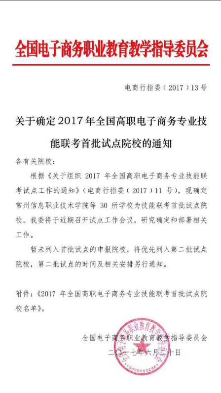6月20日,全国电子商务职业教育教学指导委员会发布通知,我院被评定为全国高职电子商务专业技能联考首批试点院校。