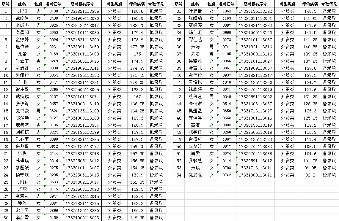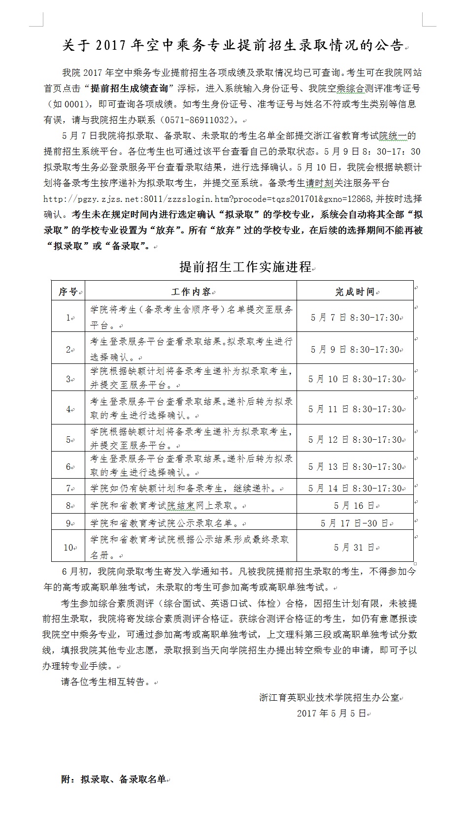 关于2017年空中乘务专业提前招生录取情况的公告