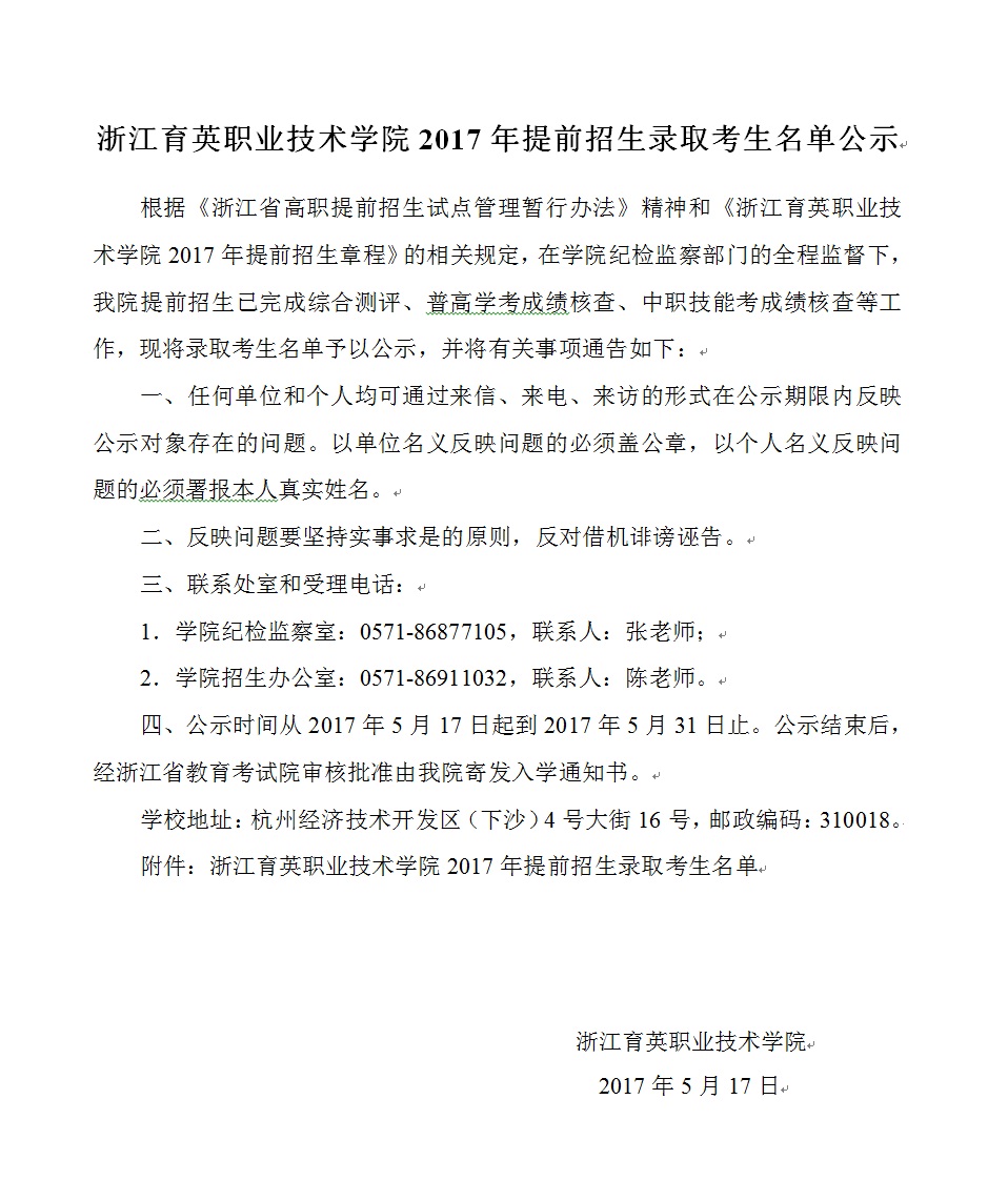 [附件:浙江育英职业技术学院2017年提前招生录取考生名单]