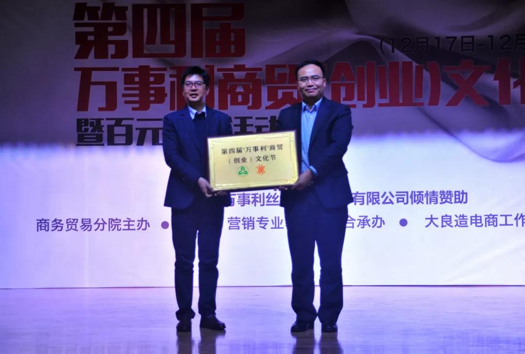 首先欧阳驹院长对此次实训进行动员讲话,他强调要把专业教育和创业融为一体,把校内校外 、线上线下结合在一起,培养同学们的创业创新能力,提高同学们的职业素质。他感谢万事利集团对本次活动的支持!学院副院长王敏老师向同学们提出这次百元实训的期望,希望同学们能创新创业,勇于参与挑战,提升自己,并祝愿本次商贸节能取得圆满成功。接着,由万事利集团提供赞助支持的丝绸模特走秀让大家眼前一亮,把东方之美展现的淋漓尽致。最后,万事利集团总经理滕俊楷进行讲话,滕总期望同学们能利用这个平台来把梦想变为现实,并讲述了万事利公司是如何把传统丝绸和企业文化有机结合。之后他为第四届“万事利”商贸(创业)文化节授牌。