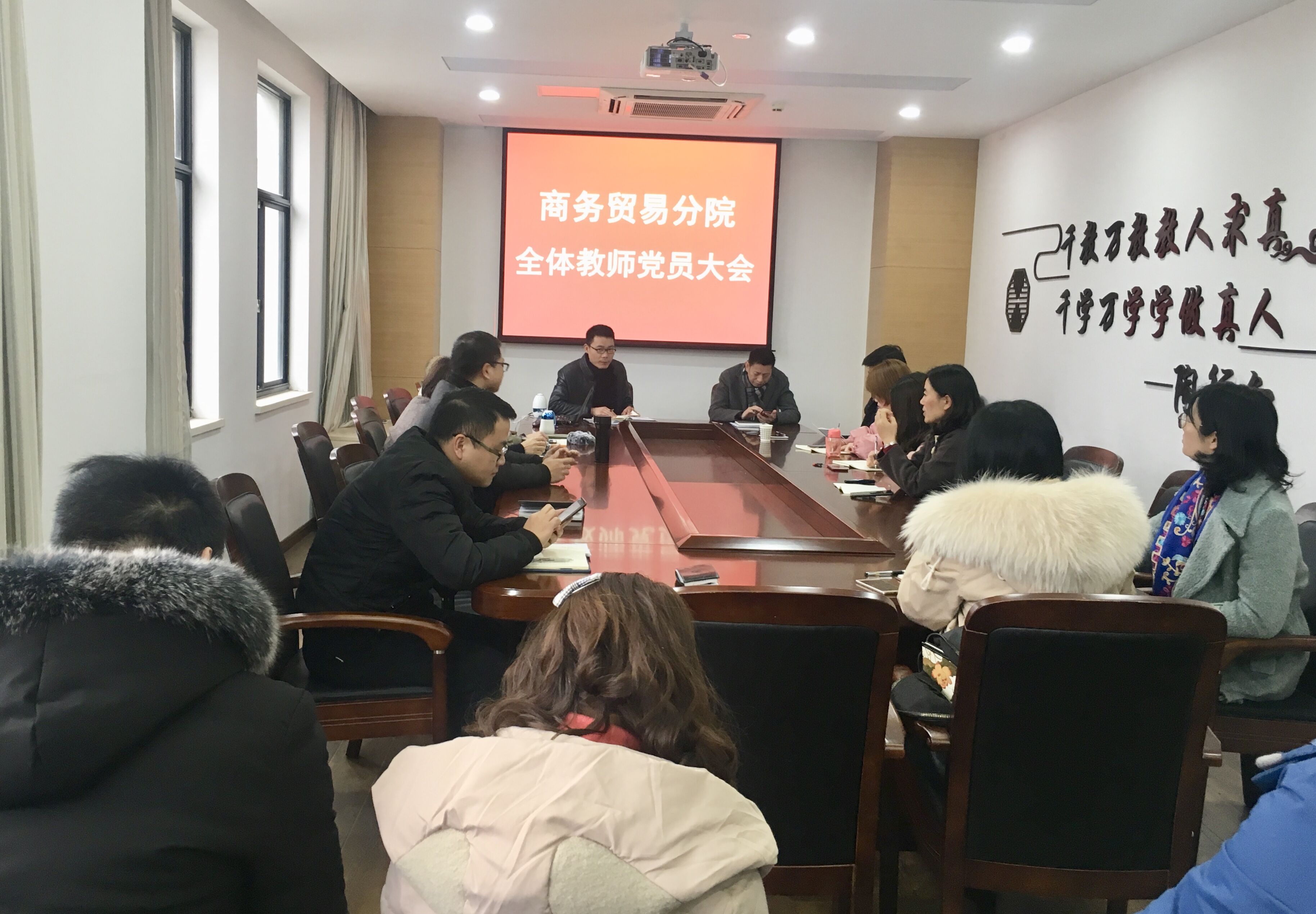 2019年2月23日下午,商贸分院党总支在跨贸基地会议室召开分院全体教师党员会议,商贸分院全体教师党员出席会议,会议由分院党总支书记王贤军主持。