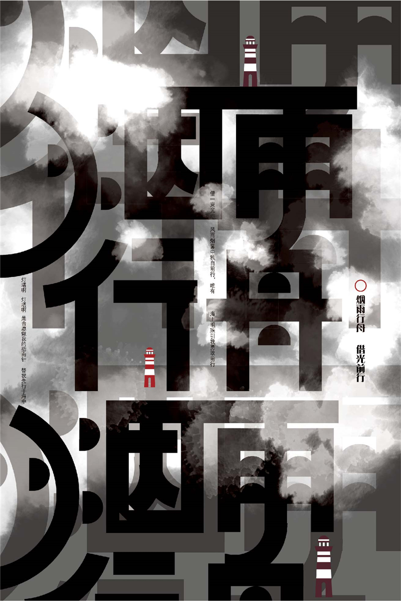 主体字右是海报的主题:“烟雨行舟借光前行”。在背景的设计上,运用大小对比、透明度对比、重复等手法进行表现,突出画面主体、营造海上的气氛。将其余的描述性文字编排成线状,穿插在字体的缝隙中,既补充说明了主旨,又增加了趣味性。