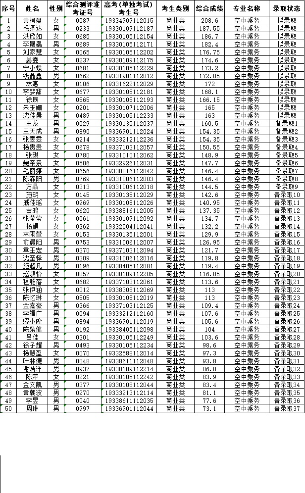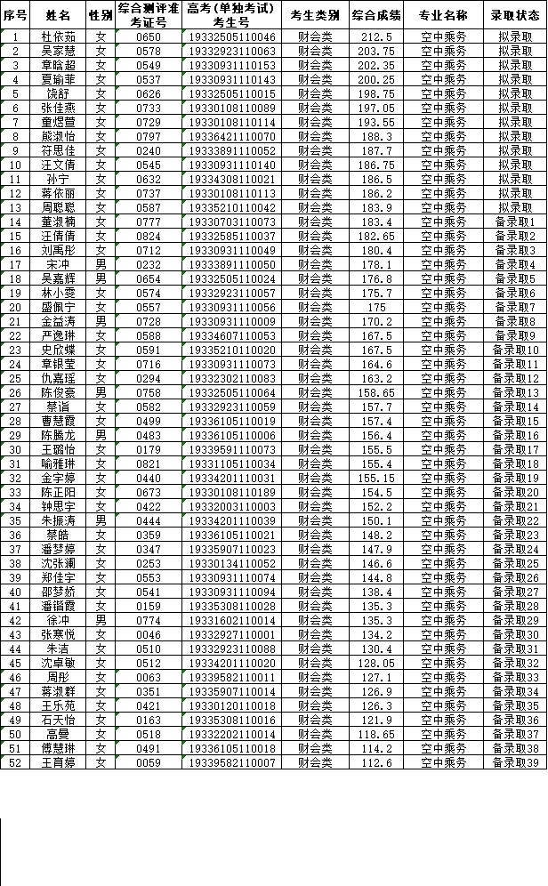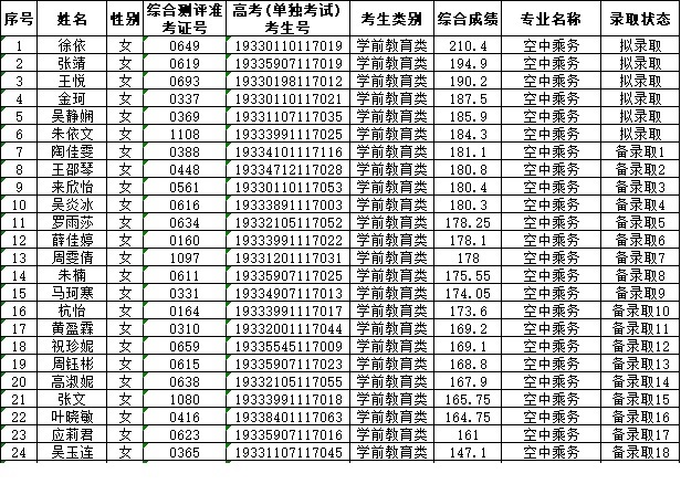 浙江育英职业技术学院2019年提前招生(空中乘务专业)拟录取、备录取考生名单