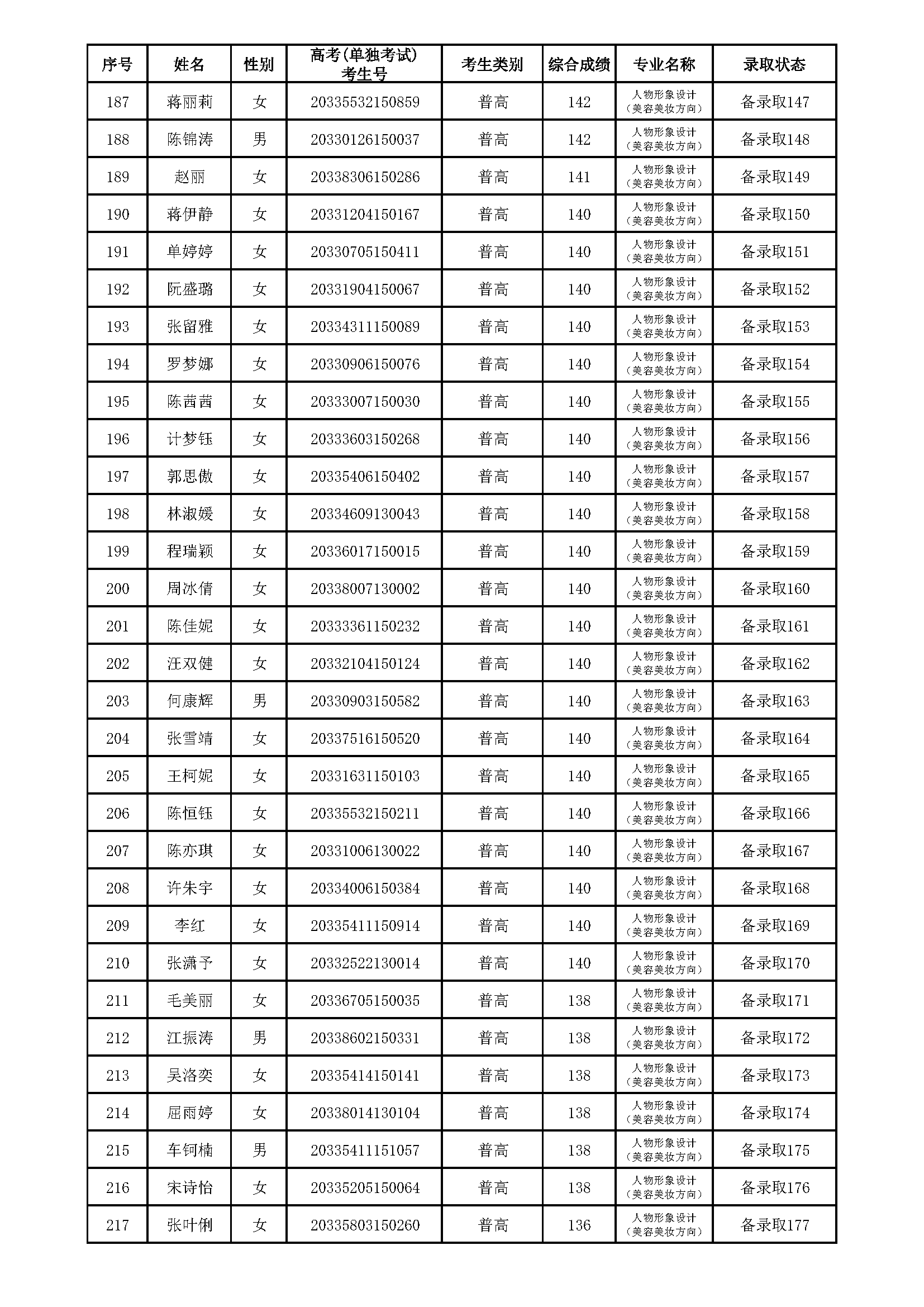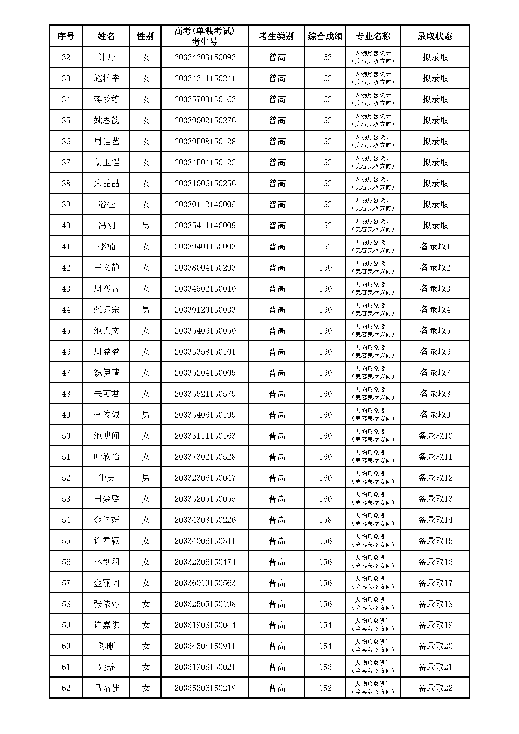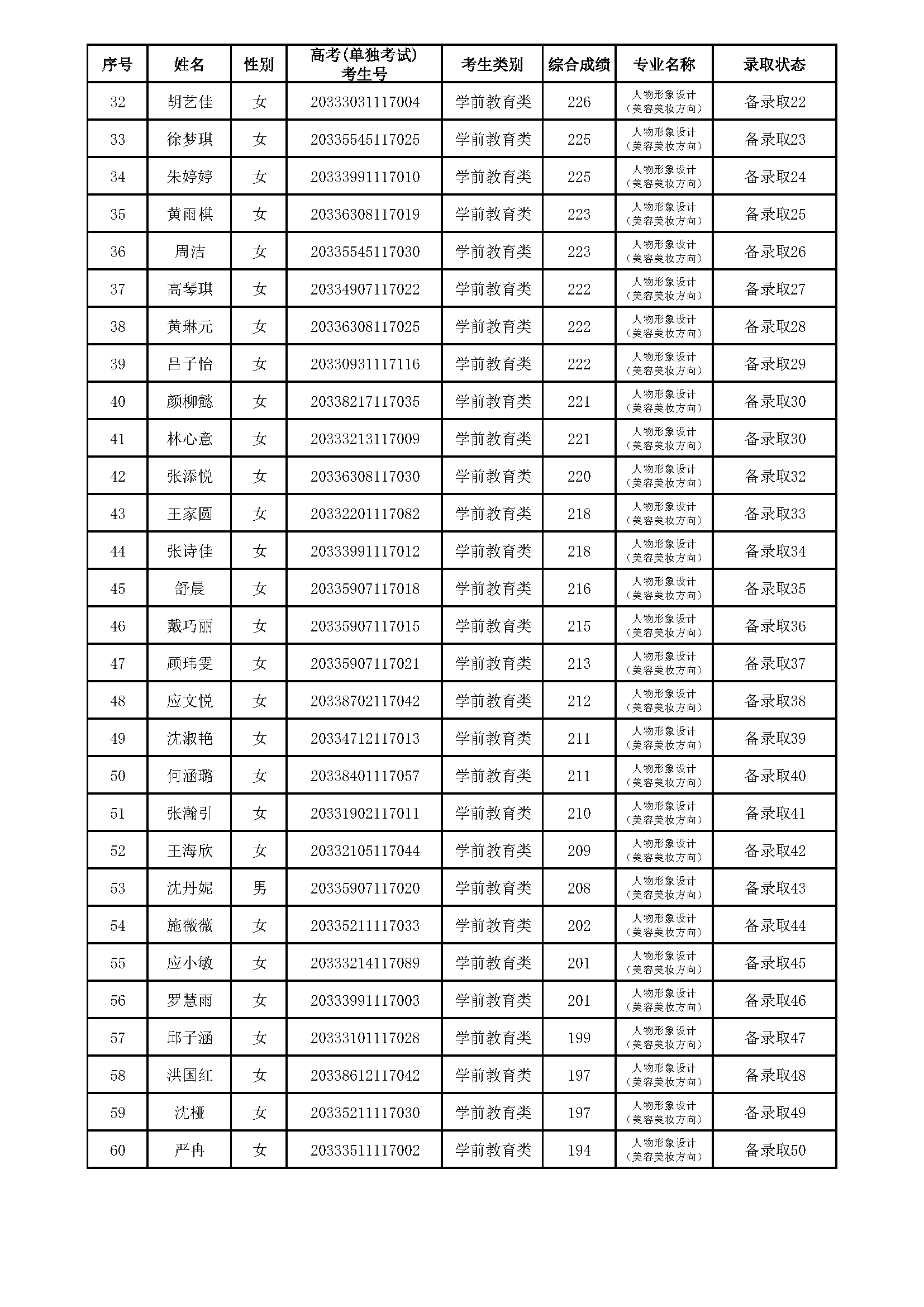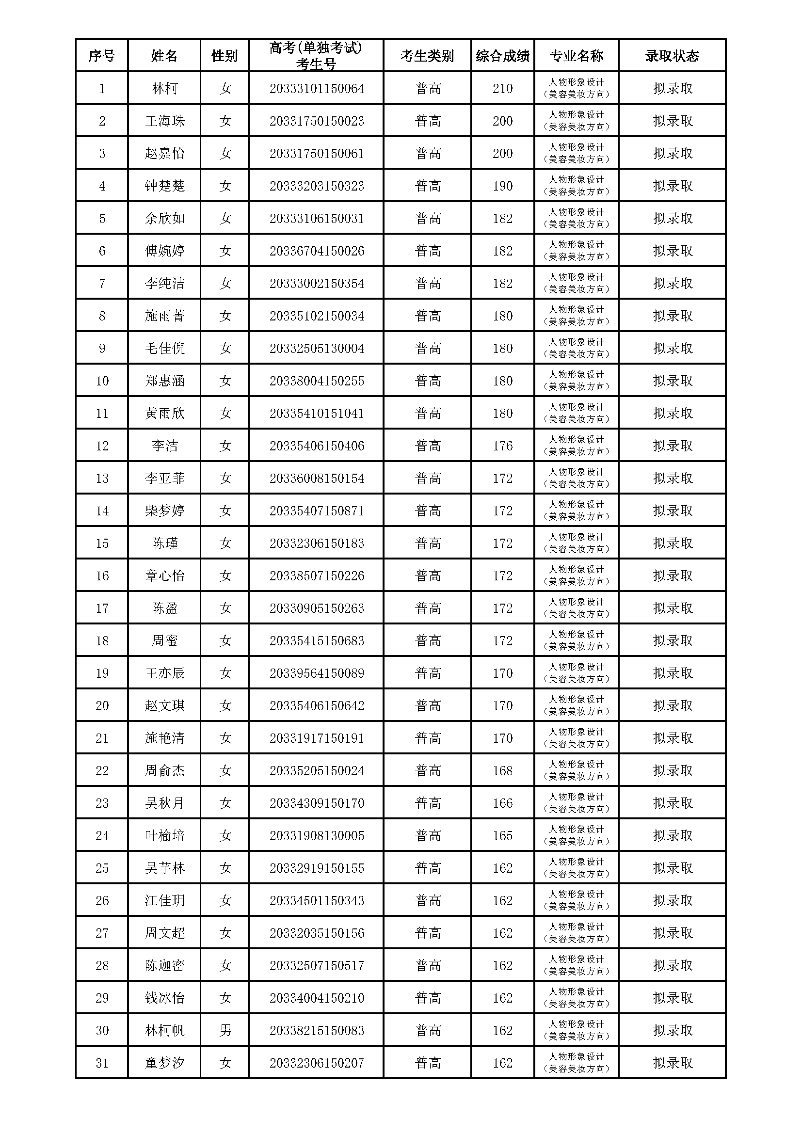浙江育英职业技术学院2020年提前招生(人物形象设计‘美容美妆方向’专业)拟录取、备录取考生名单