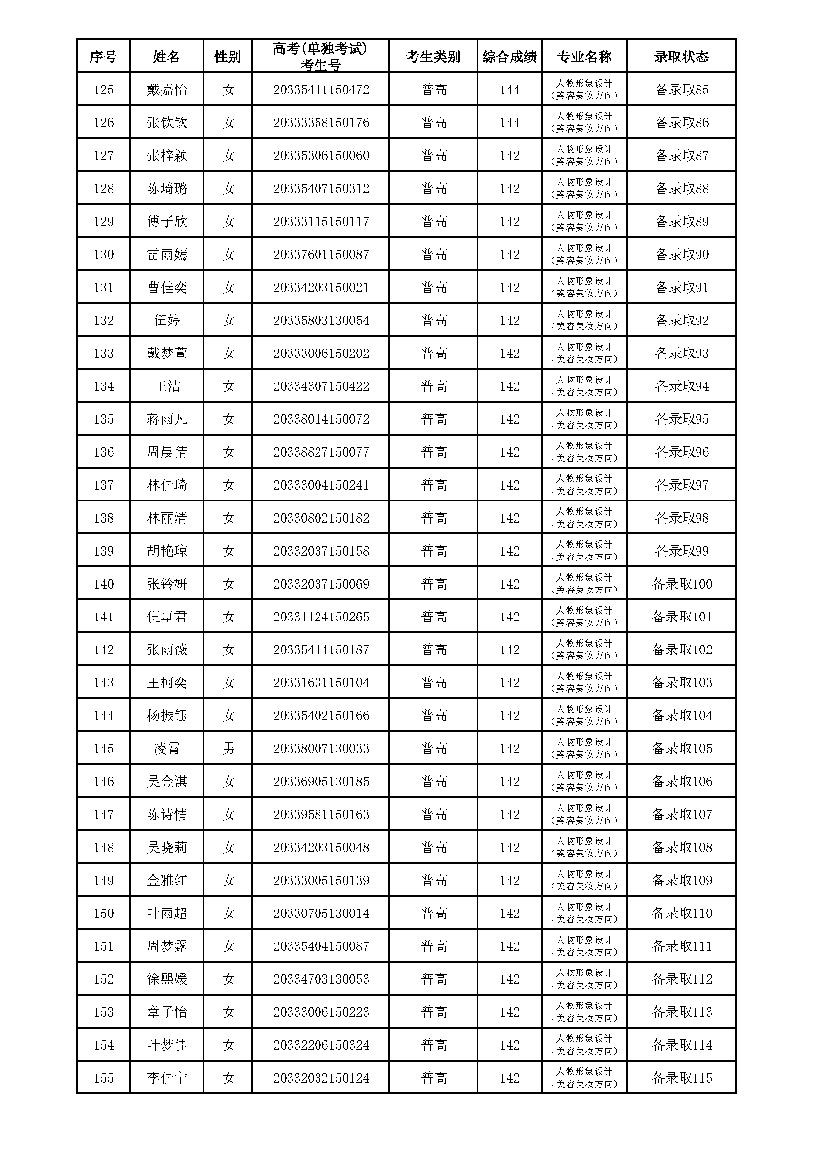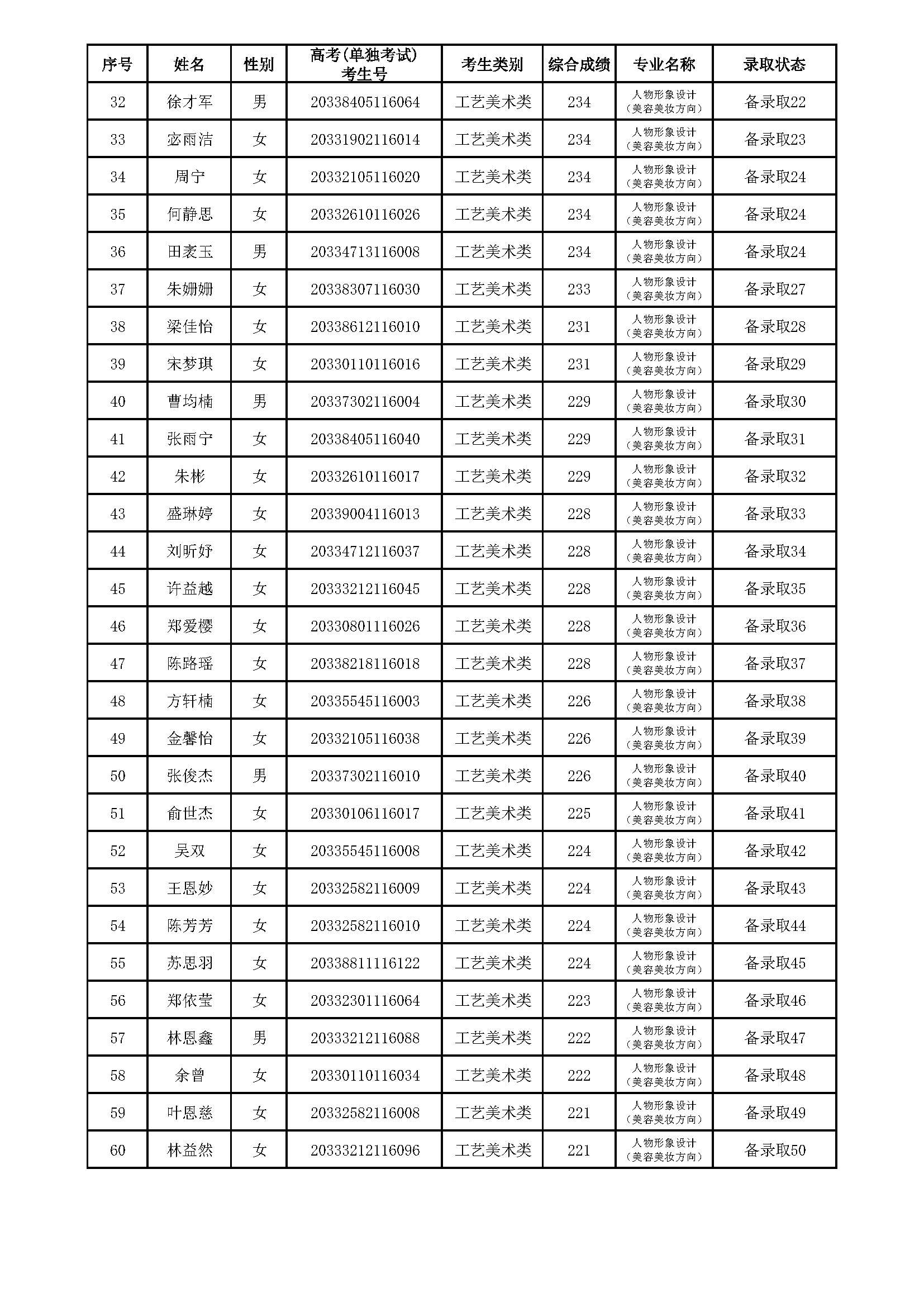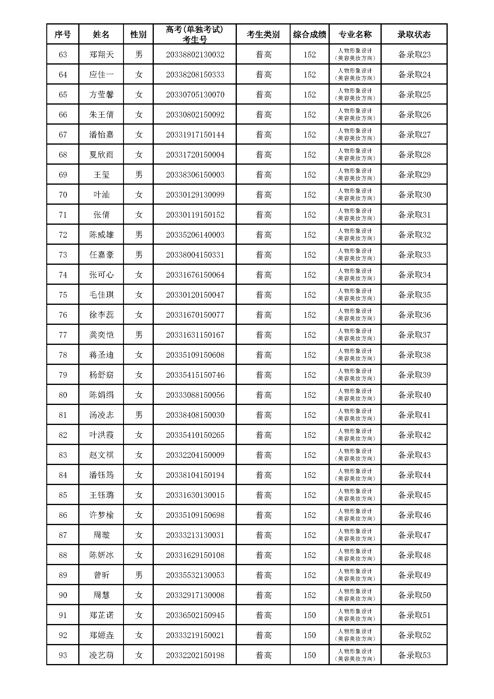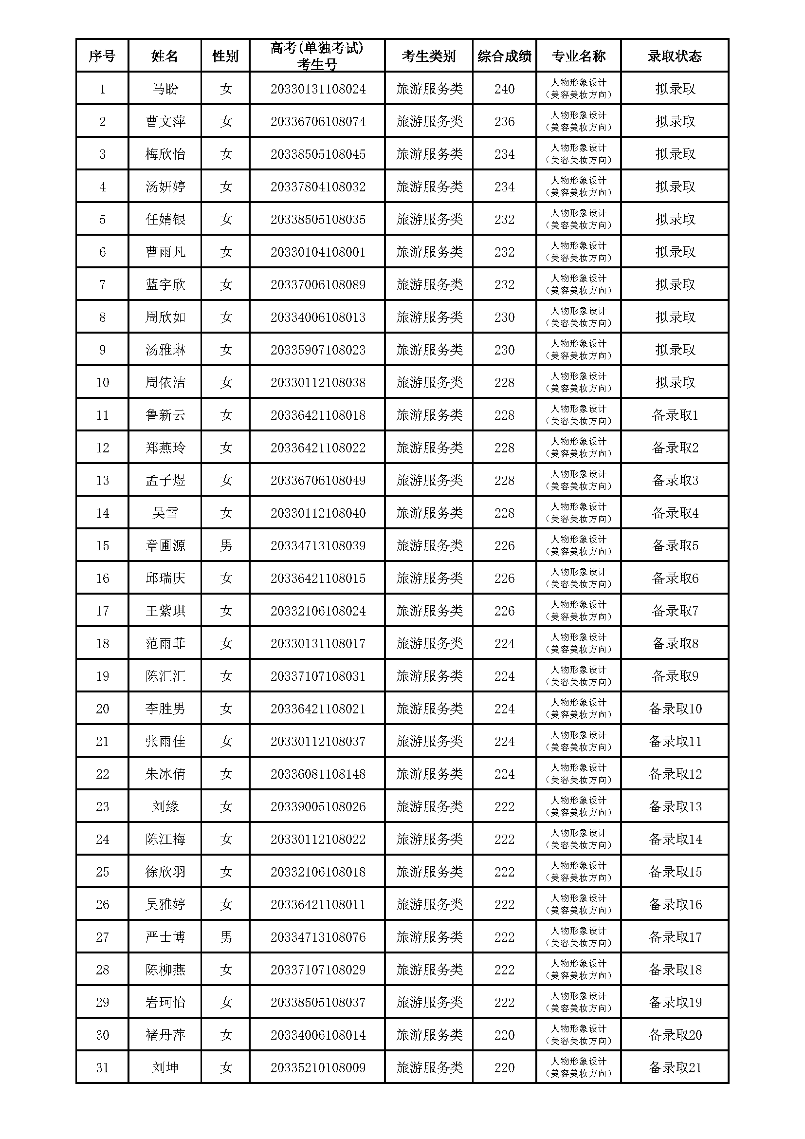 浙江育英职业技术学院2020年提前招生(人物形象设计‘美容美妆方向’专业)拟录取、备录取考生名单