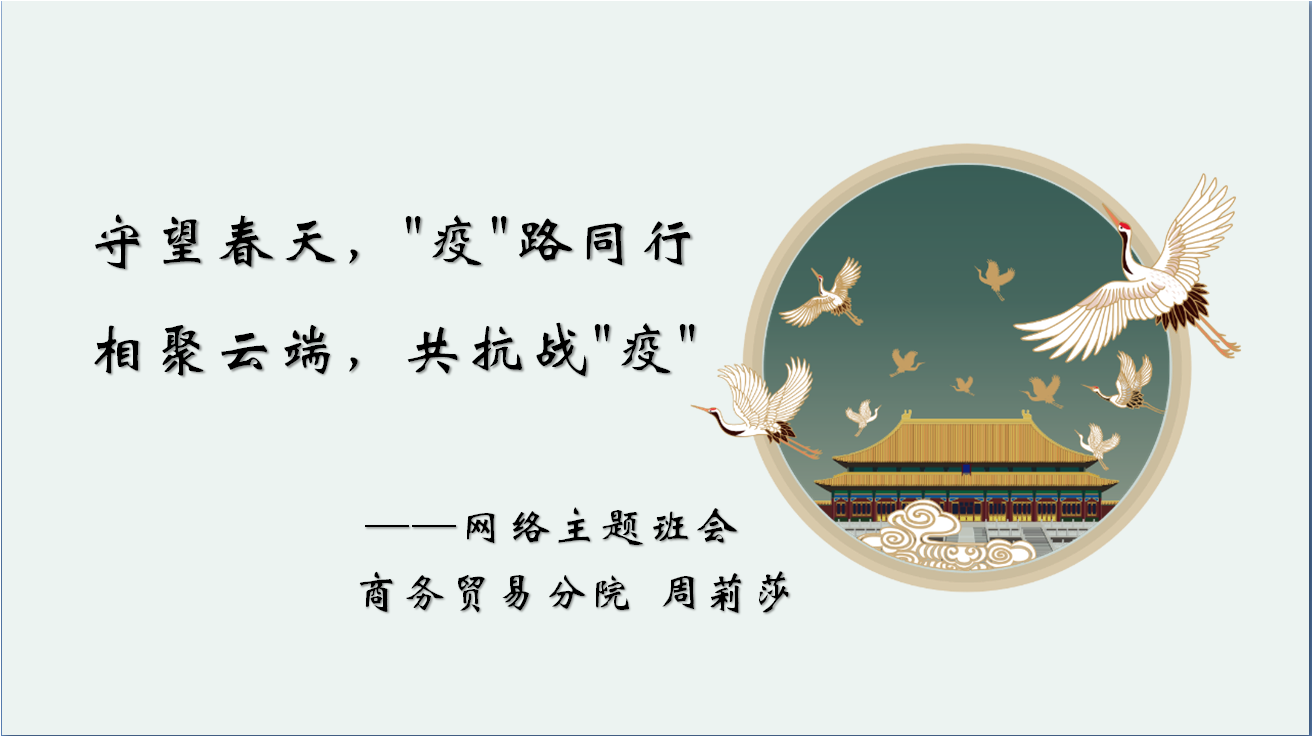 2020年2月25日晚上18:30-21:00,商务贸易分院辅导员周莉莎老师利用“腾讯会议”直播平台,组织19电商C班的同学们召开了主题为“守望春天,‘疫’路同行,相聚云端,共抗战‘疫’”的网络主题班会。