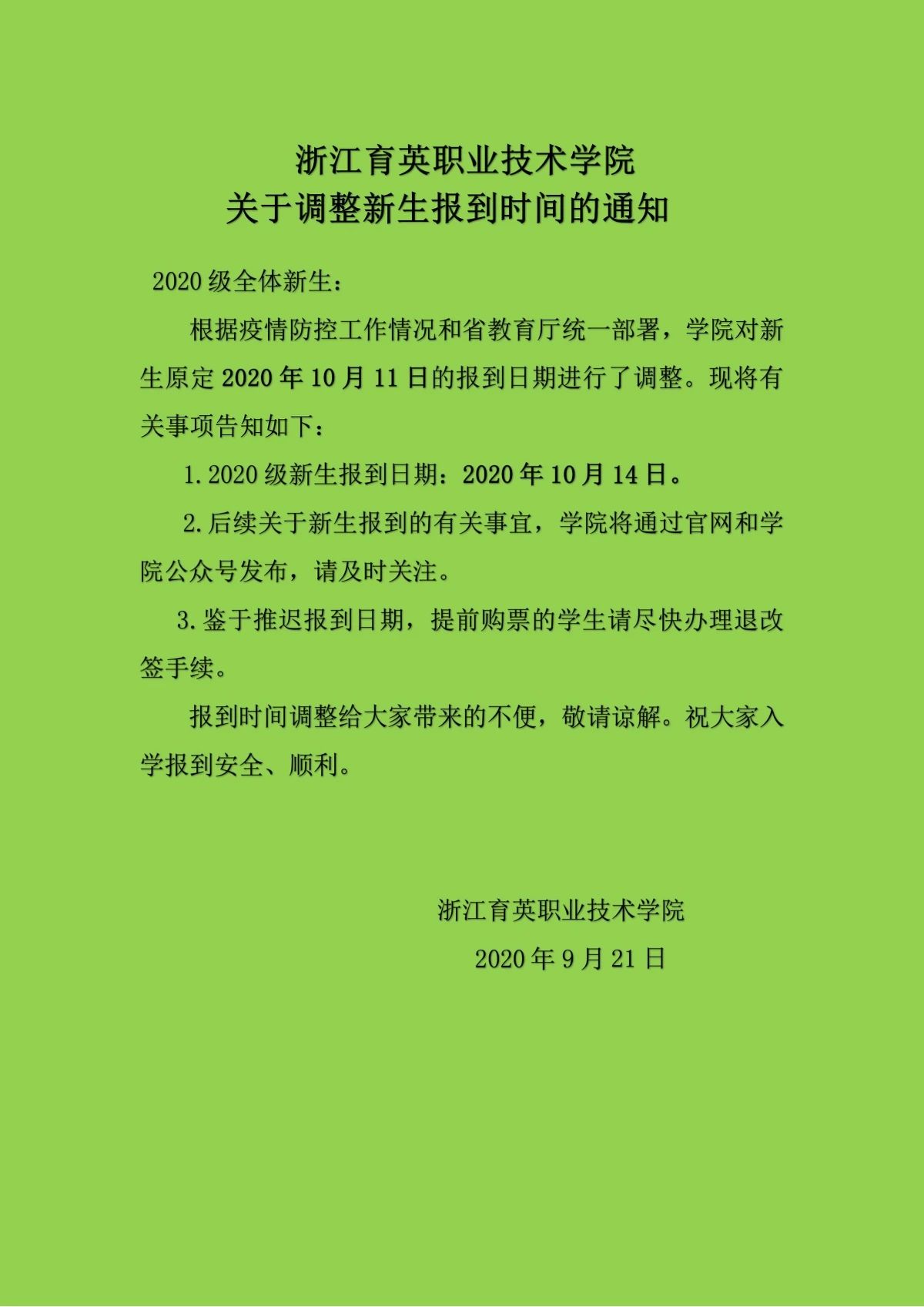 @2020级全体新生 学院关于调整新生报到时间的通知
