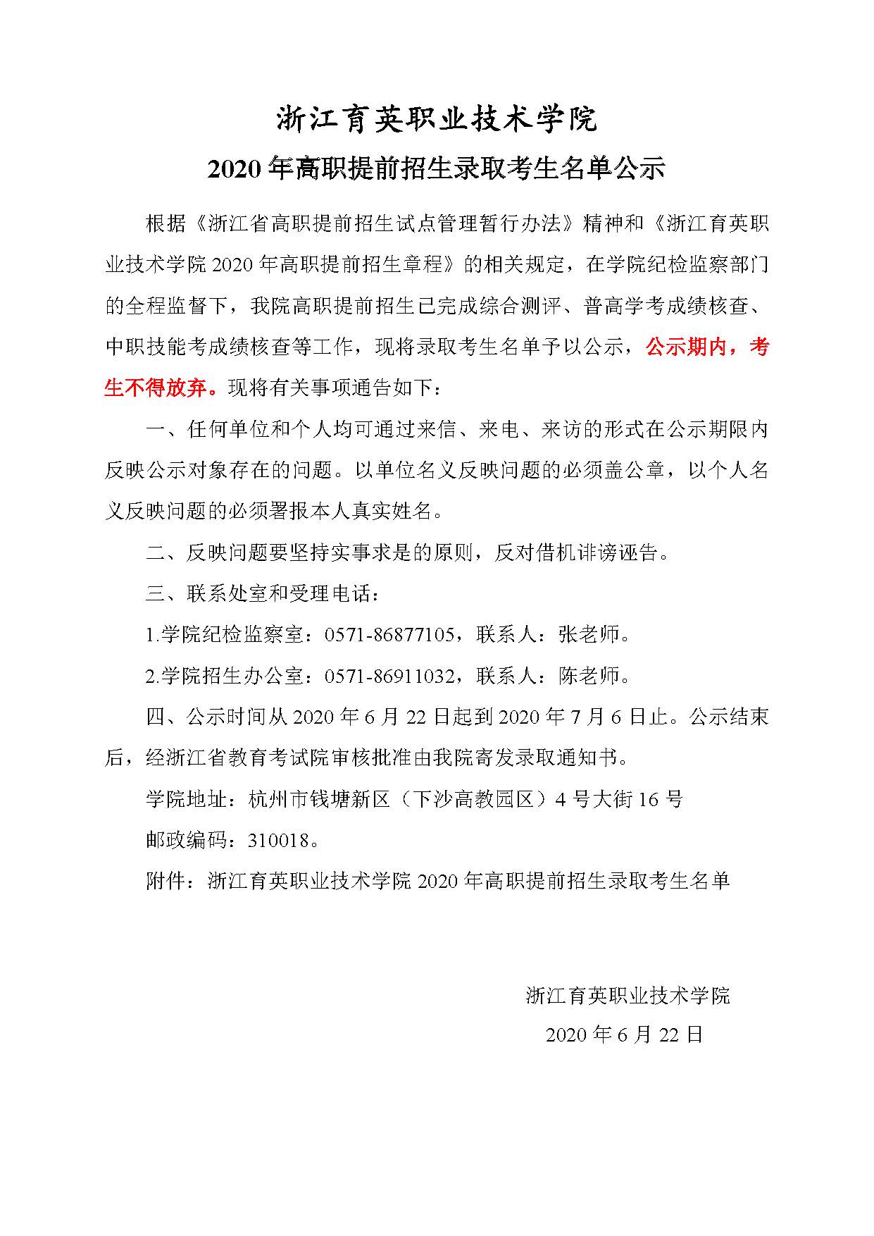 浙江育英职业技术学院2020年高职提前招生拟录取公示名单