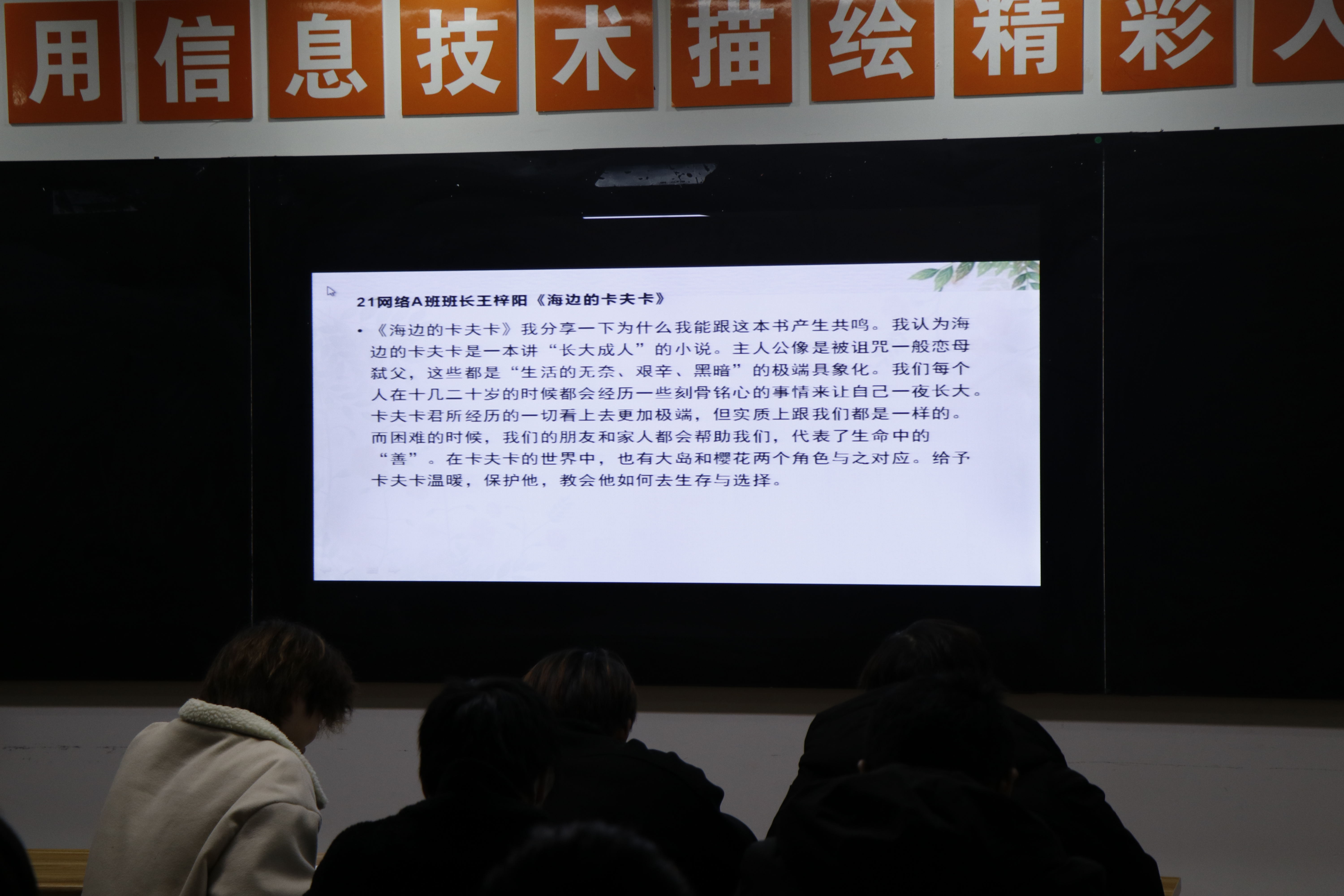 16周伊始,晚自习期间各班团支书主持此次读书分享活动,各班学生在满怀期待中开展了喜爱的书单分享,并分享阅读的感受,彼此交流心得体会。21计应A陈若男同学结合自己的人生阅历和阅读经历,感慨万千:“读书分享这个形式对我们青年人有很大好处,一个能够开拓我们新思维、活跃我们新思想,还增长知识,提高政治觉悟,过去读书在书中自有黄金屋,现在书中自有万事通,感谢这次共同学习,共同交流的机会”。21网络班的学生们也纷纷表示:“此次活动,形式很好,触动很大,我们应该在以后学习工作生活中,注重读书,养成良好的阅读习惯,丰富知识,提升综合素质,顺应时代发展的要求,做一名合格的大学生”。
