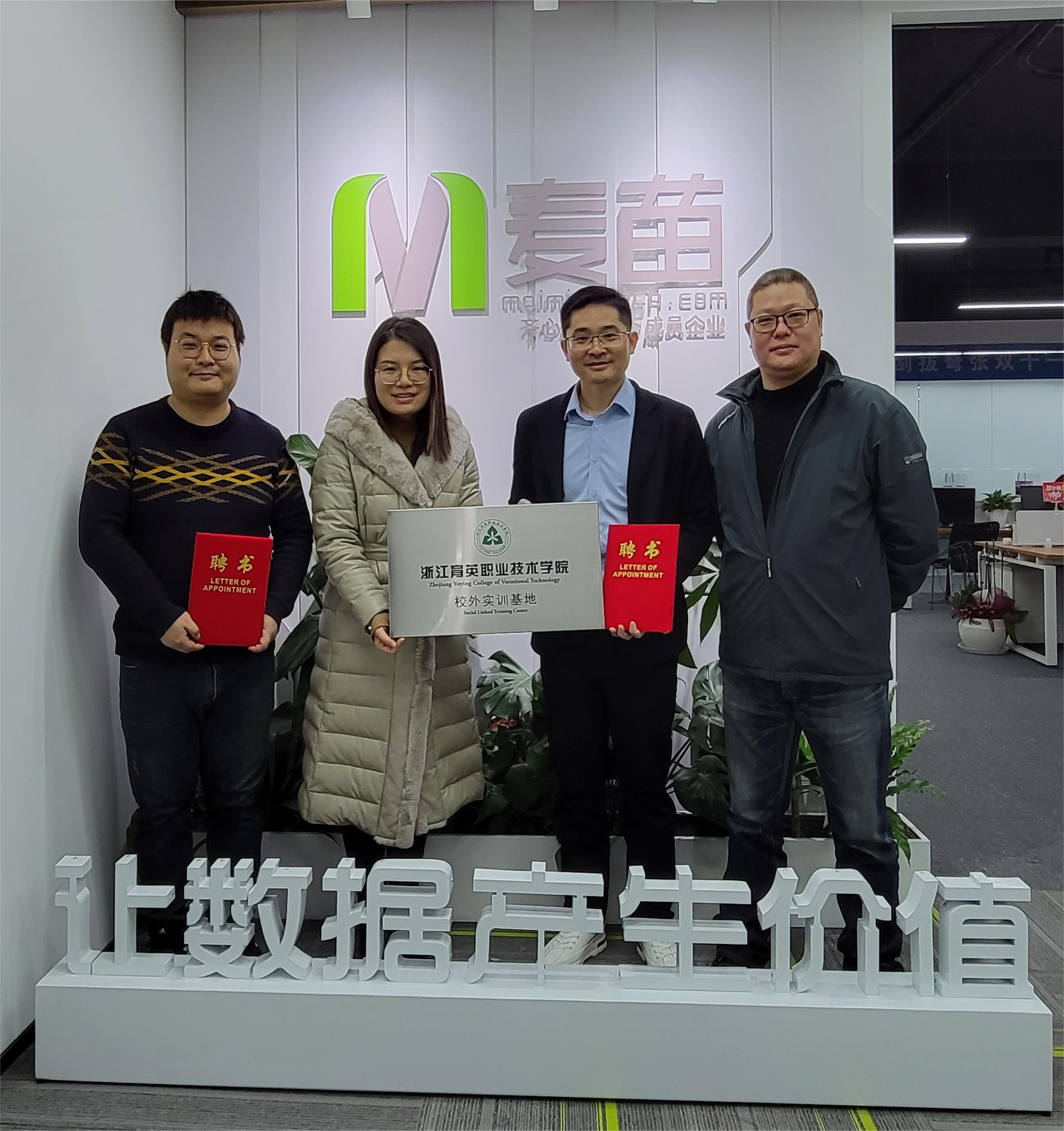 交流中,陈院长分别代表数字商贸学院聘请舒俊凯先生为数字商贸学院电子商务专业特聘专家、杨靖勇先生为数字商贸学院电子商务专业建设委员会特聘专家,并向两位专业颁发聘书;为促进合作,陈院长代表数字商贸学院向杭州麦苗网络技术有限公司授予浙江育英职业技术学院校外实训基地牌匾,杨靖勇先生代表公司揭牌。