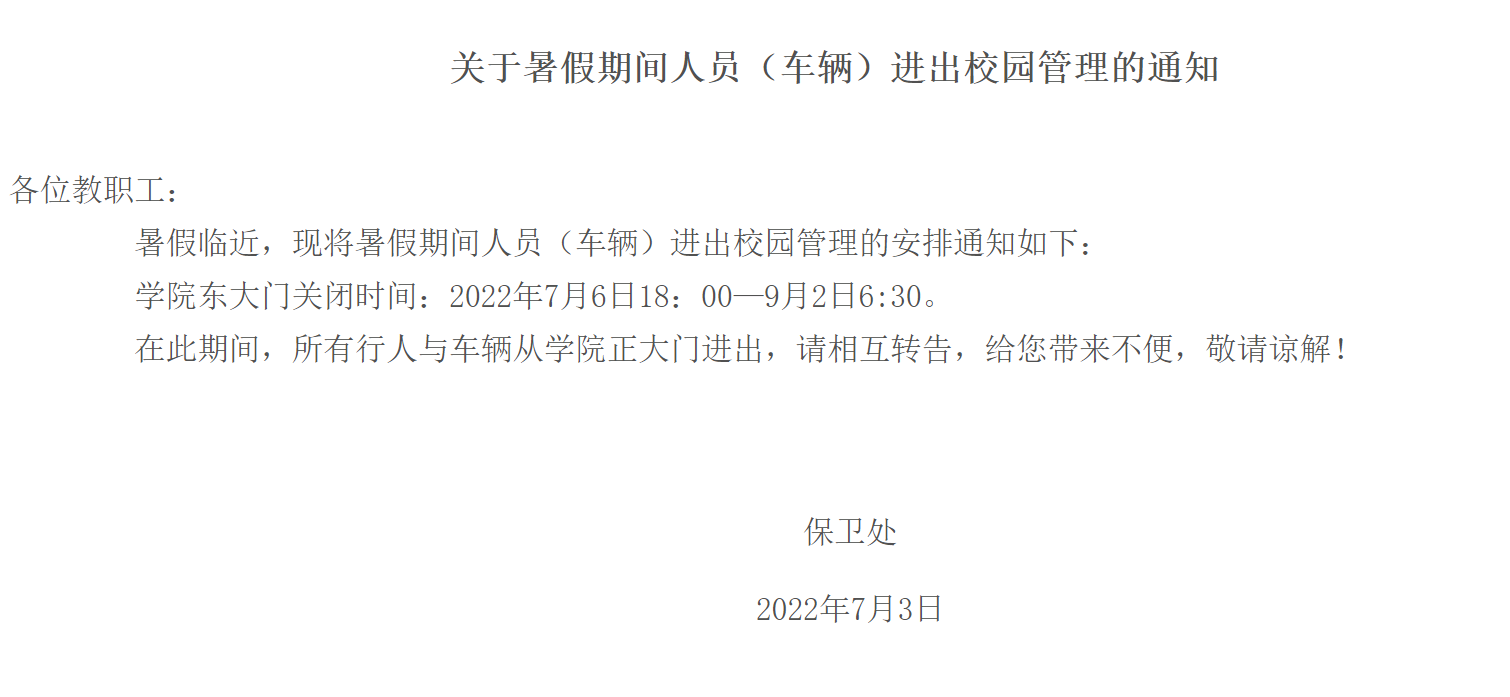 关于暑假期间人员(车辆)进出校园管理的通知