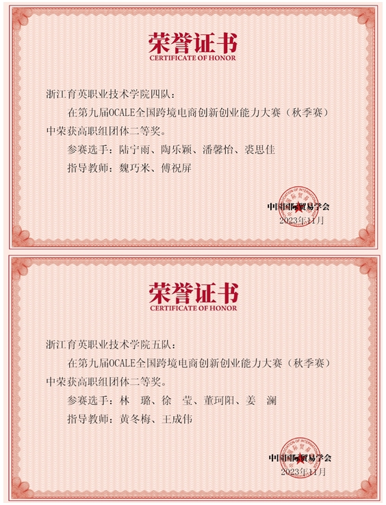 22跨境A班孙羽佳、付淑、沈雨燕、周雪雪团队,22五年国贸潘磬怡、裘思佳、23五年国贸陆宁雨、陶乐颖团队,22国商B班徐莹、林璐,22国商A班姜澜、23五年国贸董珂阳团队,均获团体二等奖。