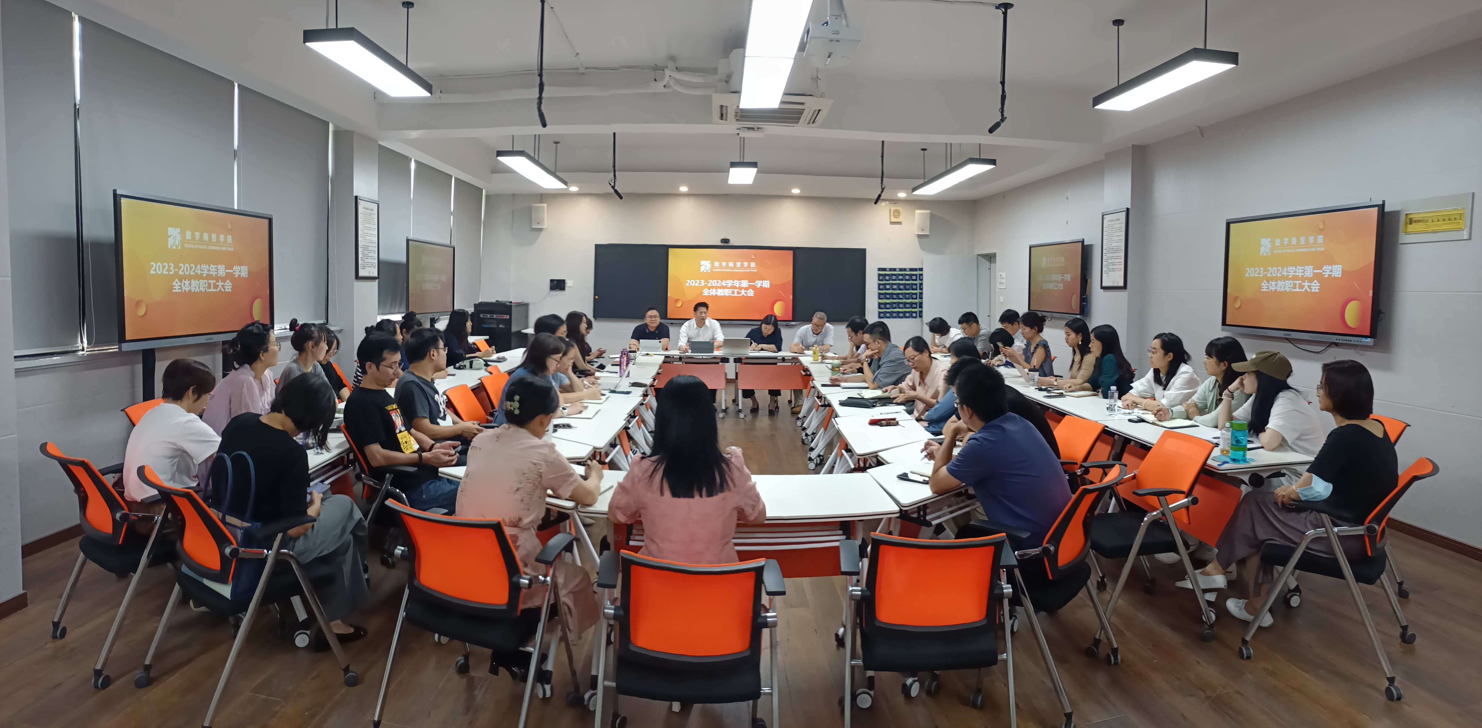 2023年9月2日下午14:00,数字商贸学院在3213智慧教室召开了2023-2024学年第一学期第一次全体教师大会。学院党总支书记、院长欧阳驹,党总支副书记、副院长姜蕾,院长助理章雁峰、吴有权及全体教师参加,会议由综合办主任王成伟主持。