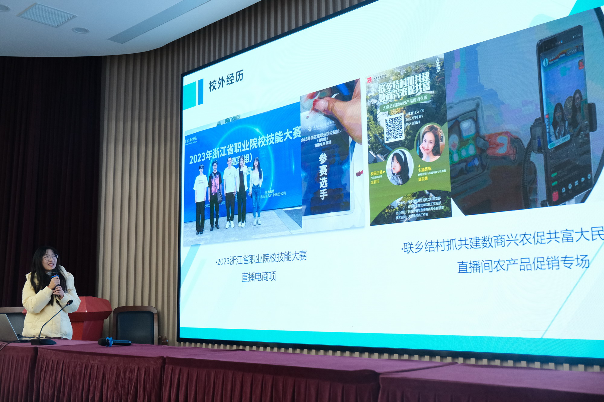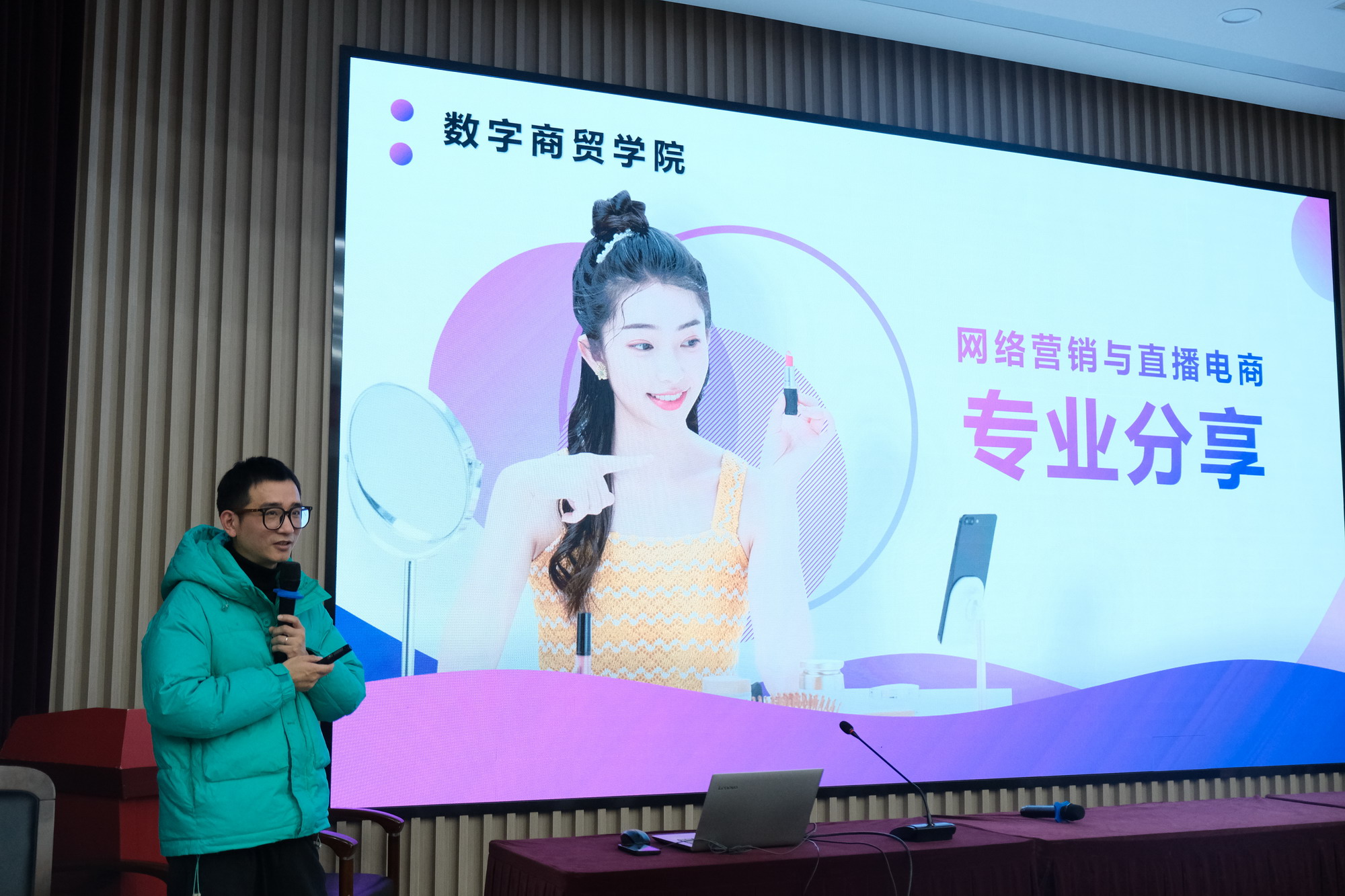 下午14点,100多名同学齐聚一号报告厅,聆听了学校相关讲座。首先,数字商贸学院院长助理吴有权老师介绍了育英学校和数字商贸学院的概况,并对数字商贸学院的专业构成及课程内容进行了简要介绍。接着,网络营销与直播电商专业负责人郑天为同学们详细介绍了该专业的基本情况,从直播行业到专业内容,系统地为同学们阐述了升学后的学习与培养方向。郑老师还通过近几年的教学、外事和实践活动视频向同学们展示了专业的活动。最后,21直播电商专业的学姐金碧洋上台,以学姐的身份分享了她三年来在专业学习与实践中的经历,并激励学弟学妹们要认真学习专业知识,积极参与学校的实践项目。