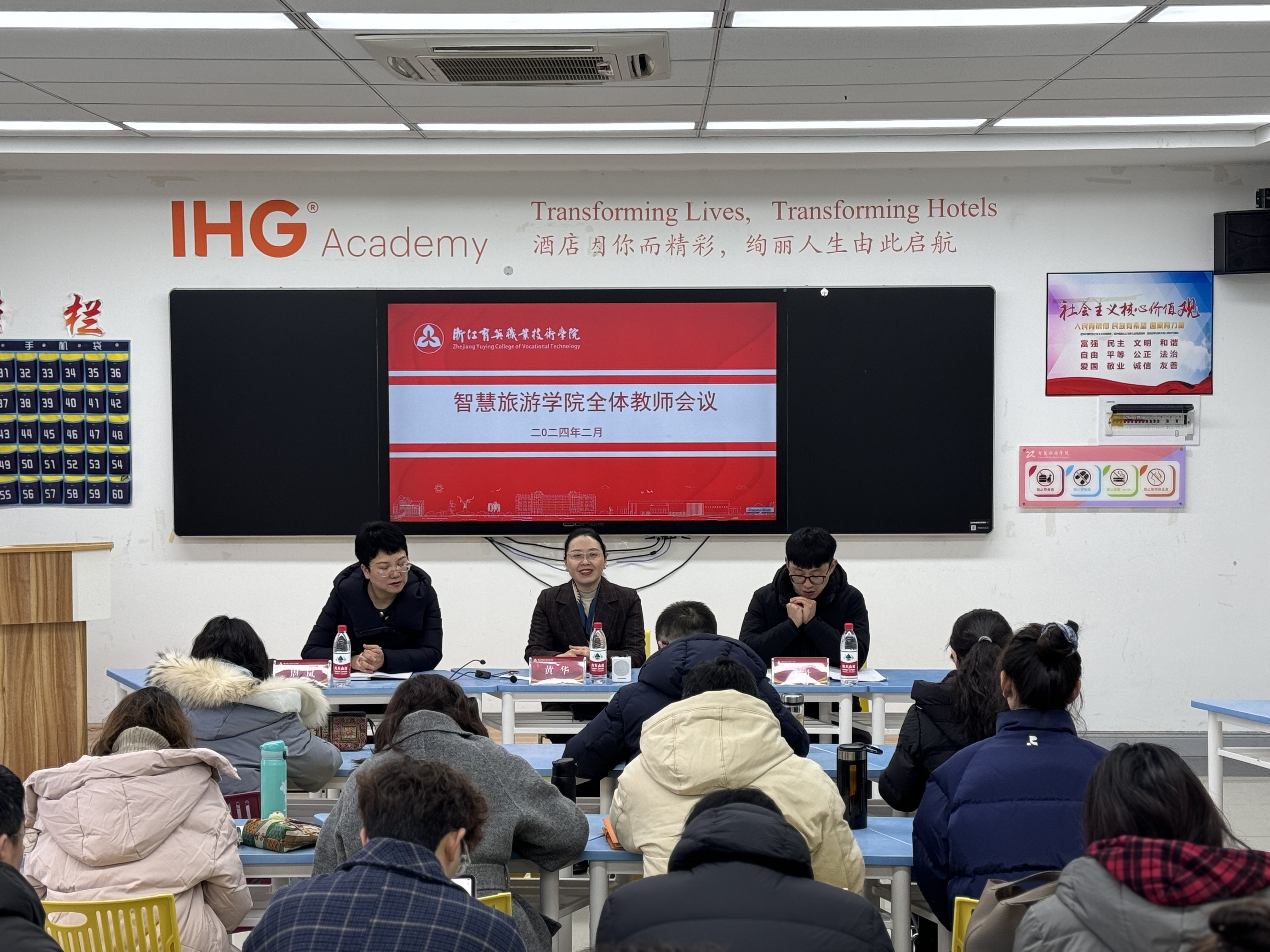 会议第三项,学院领导给老师颁发专业技术聘书。希望老师们牢记教育初心使命,再接再厉,以身作则,率先垂范,砥砺前行!表彰之后黄华院长做学期工作布置,传达了学院党政工作会议精神。对上学期工作做了简单回顾,并对本学期工作进行了逐项解读,在会上作了“总结、复盘、再提升”主题工作报告,学院全体教师认真学习,聚力学院新发展。新学期旅游学院将继续实施“岗课赛证”综合实践育人,加大“专业-职业-岗位、课程-能力-比赛“教改力度,以“三三三”职业素养体系为育人载体,培养学生“三种精神”,形成“和合共融 务实创新”院风,培养“国际化、品质化、数智化”的高品德高素质复合型旅游管理人才。讲话最后,黄院长希望学院全体教师可以在新的学期以更饱满的精神状态进入新的征程,团结协作,迎接挑战。
