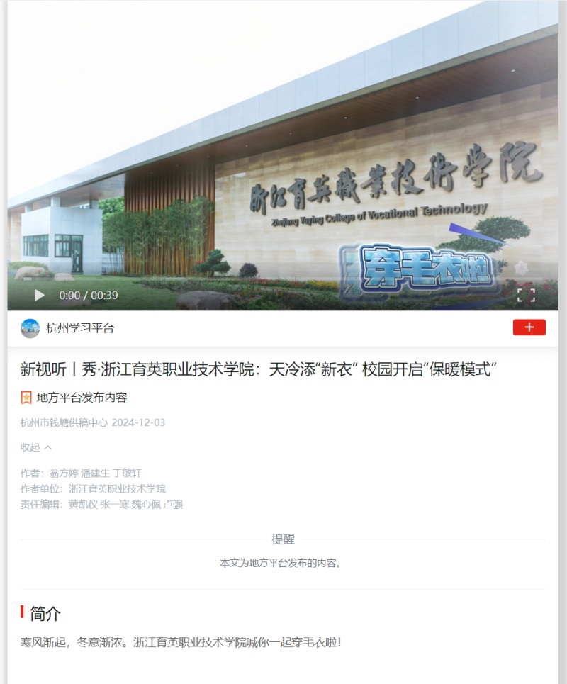 【学习强国】新视听丨秀·浙江育英职业技术学院:天冷添“新衣” 校园开启“保暖模式”
