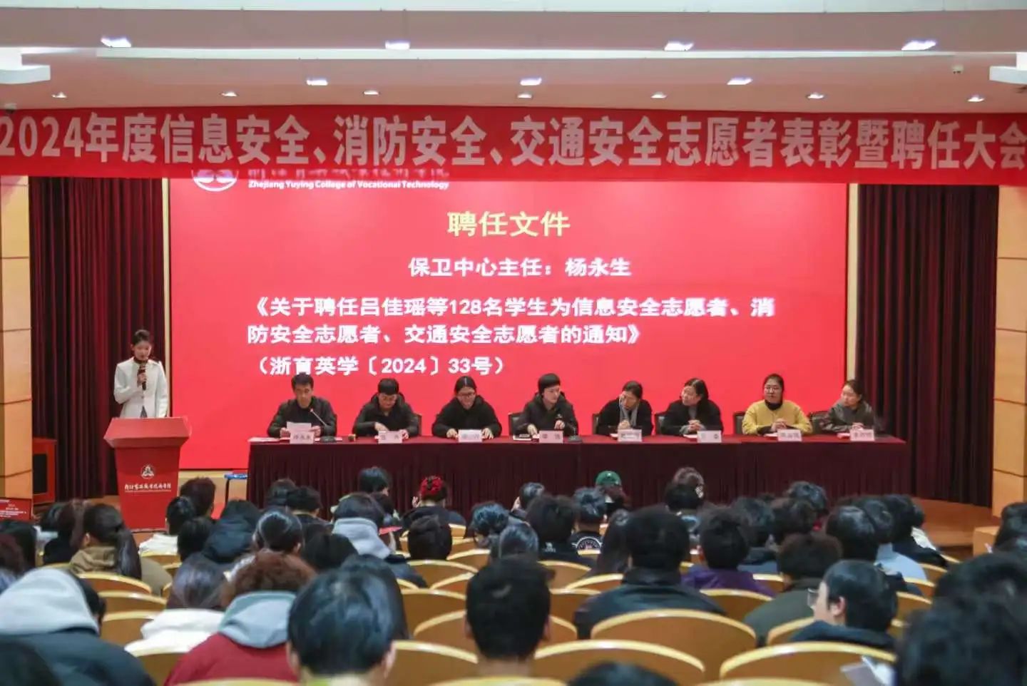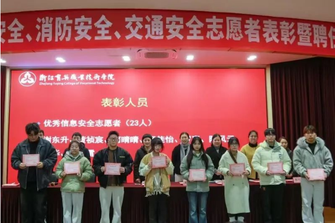 大会表彰了2024年44名优秀信息员、志愿者并颁发了荣誉证书,新聘任24级128名学生成为信息安全志愿者。