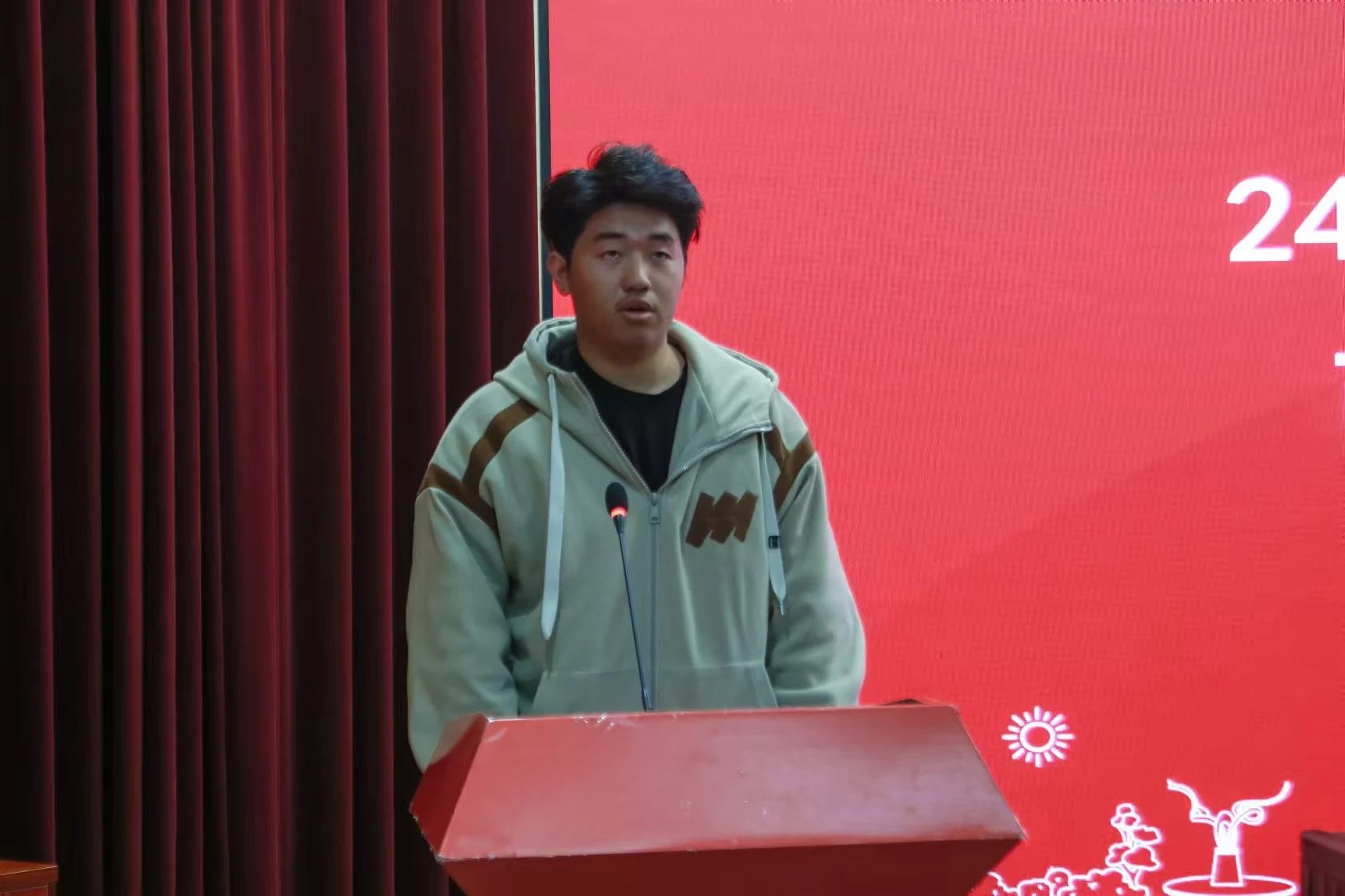 数字技术学院胡壹楠代表新聘任志愿者发言。他表示新聘任志愿者将继续努力并号召全体同学遵守规则、法规,呼吁同学们一起行动,共同营造安全和谐校园环境。