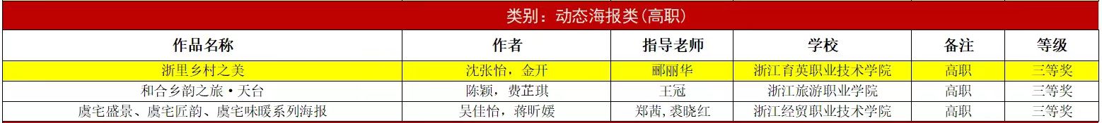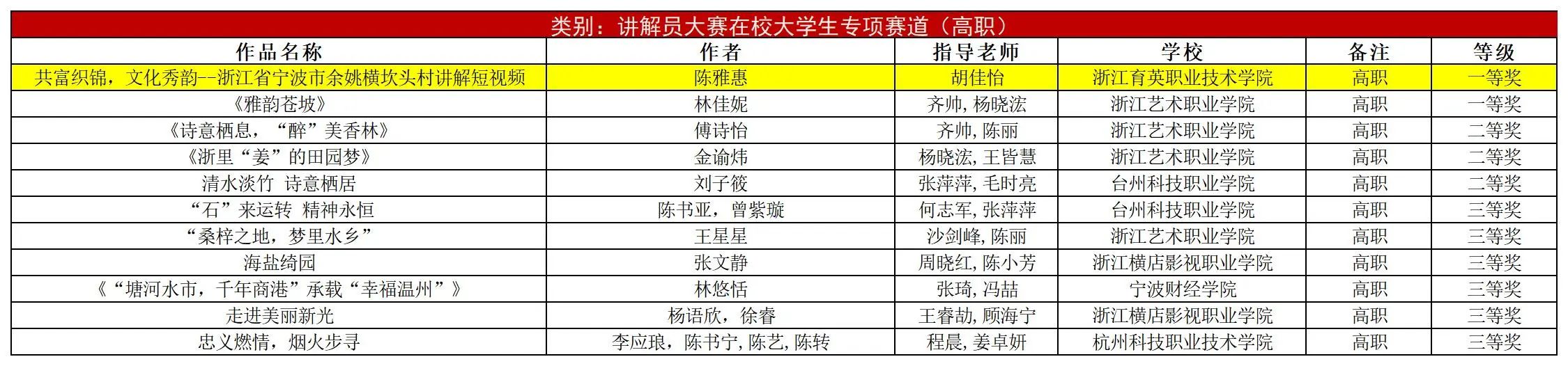 竞赛由浙江省教育厅、浙江省文化广电和旅游厅等单位联合主办,共计收到参赛作品1188件,产生一等奖70件,占总作品数的5.89%;二等奖143件,占总作品数的12.03%;三等奖211件,占总作品数的17.76%。总获奖率为35.68%。其中讲解员专项赛道参赛作品119件,高职组评审出一等奖2件,二等奖3件,三等奖6件。