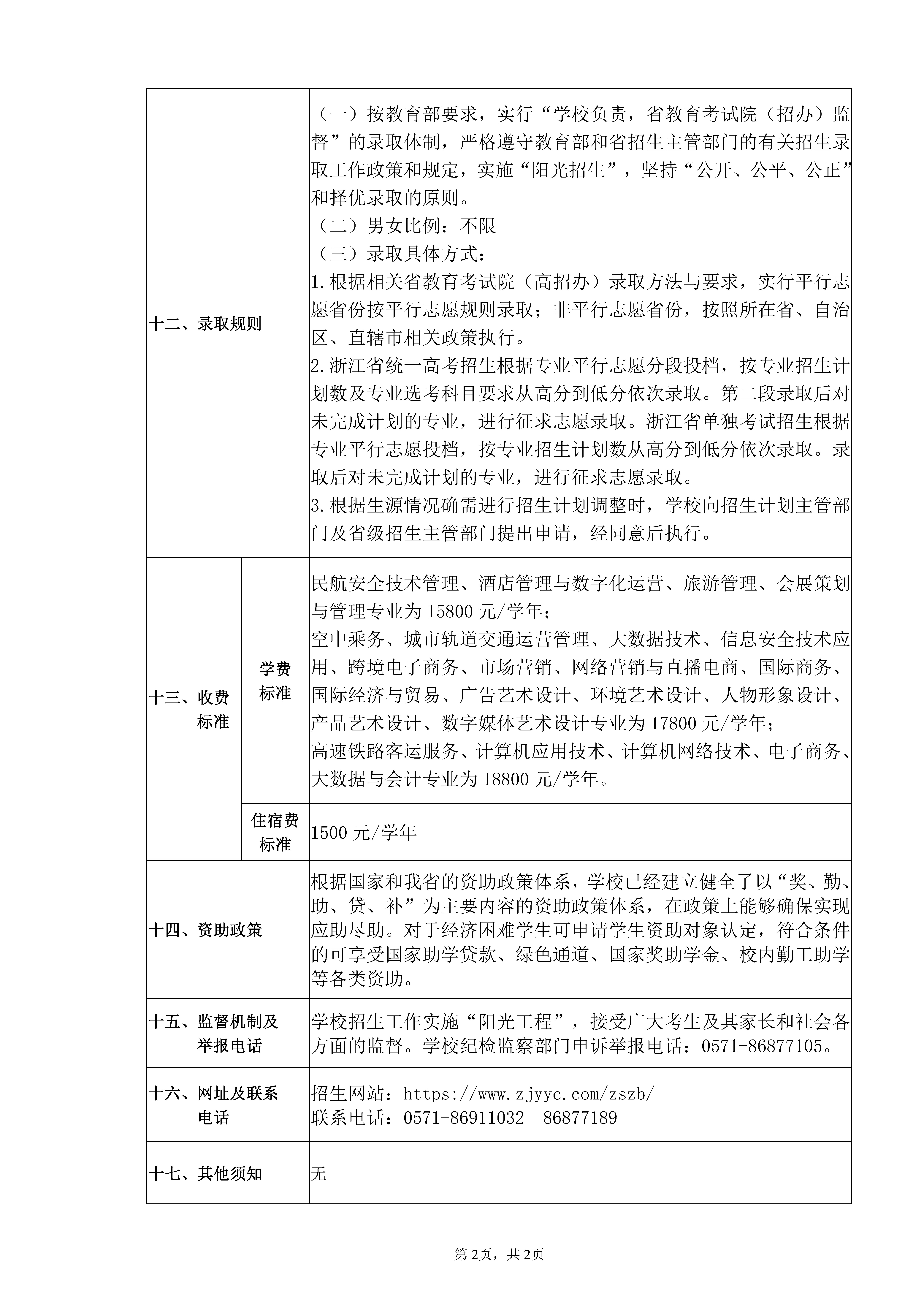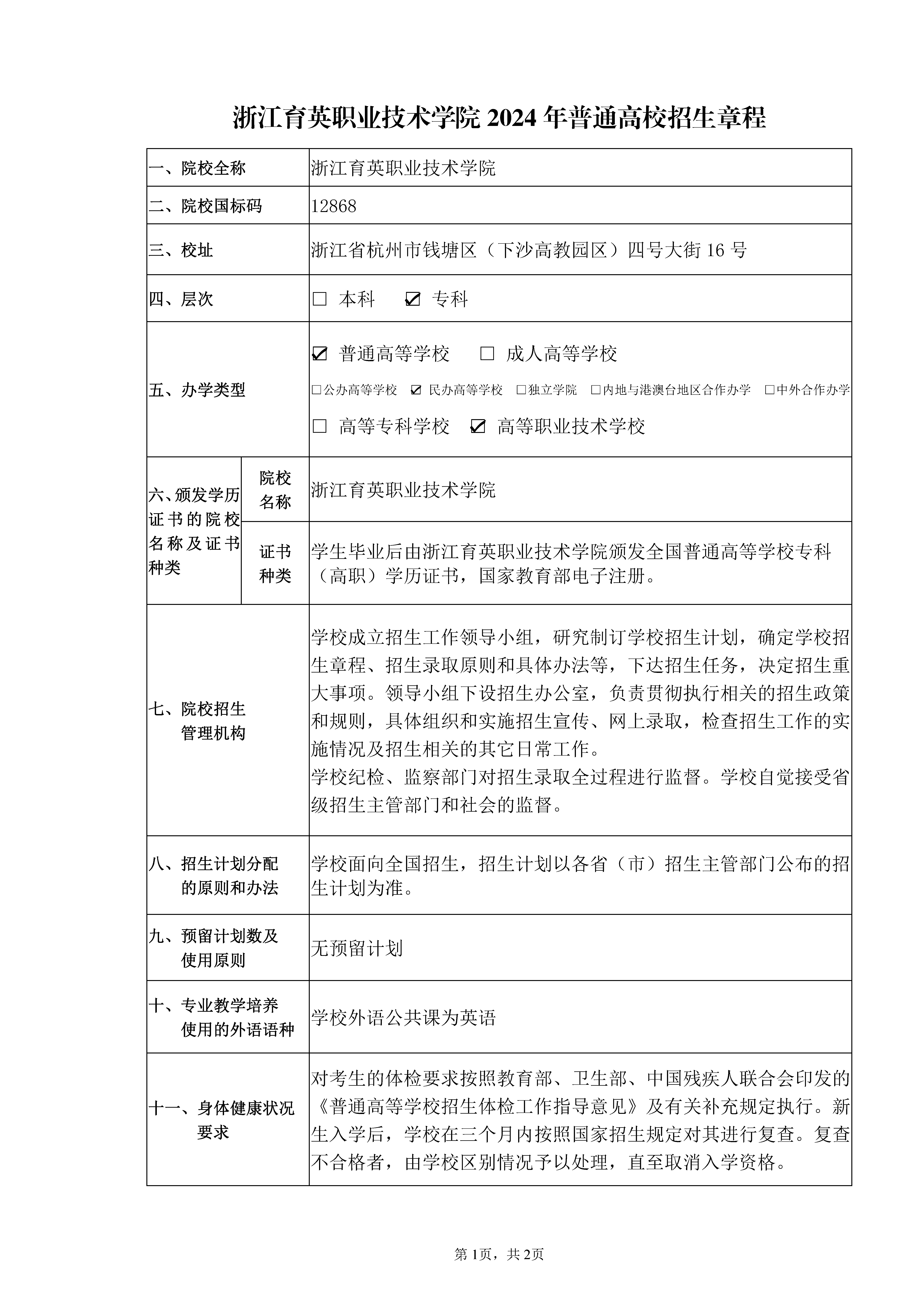 浙江育英职业技术学院2024 年普通高校招生章程