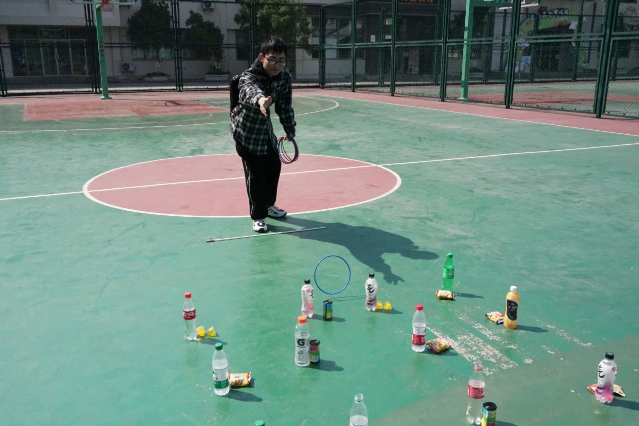 套圈套住的不仅是奖品,更是安全意识!矿泉水瓶、易拉罐变身套圈道具,套中目标即可抽取安全知识问答卡,从“灭火器使用方法”到“宿舍违禁电器清单”,边玩边涨知识,现场惊现“套圈神射手”!