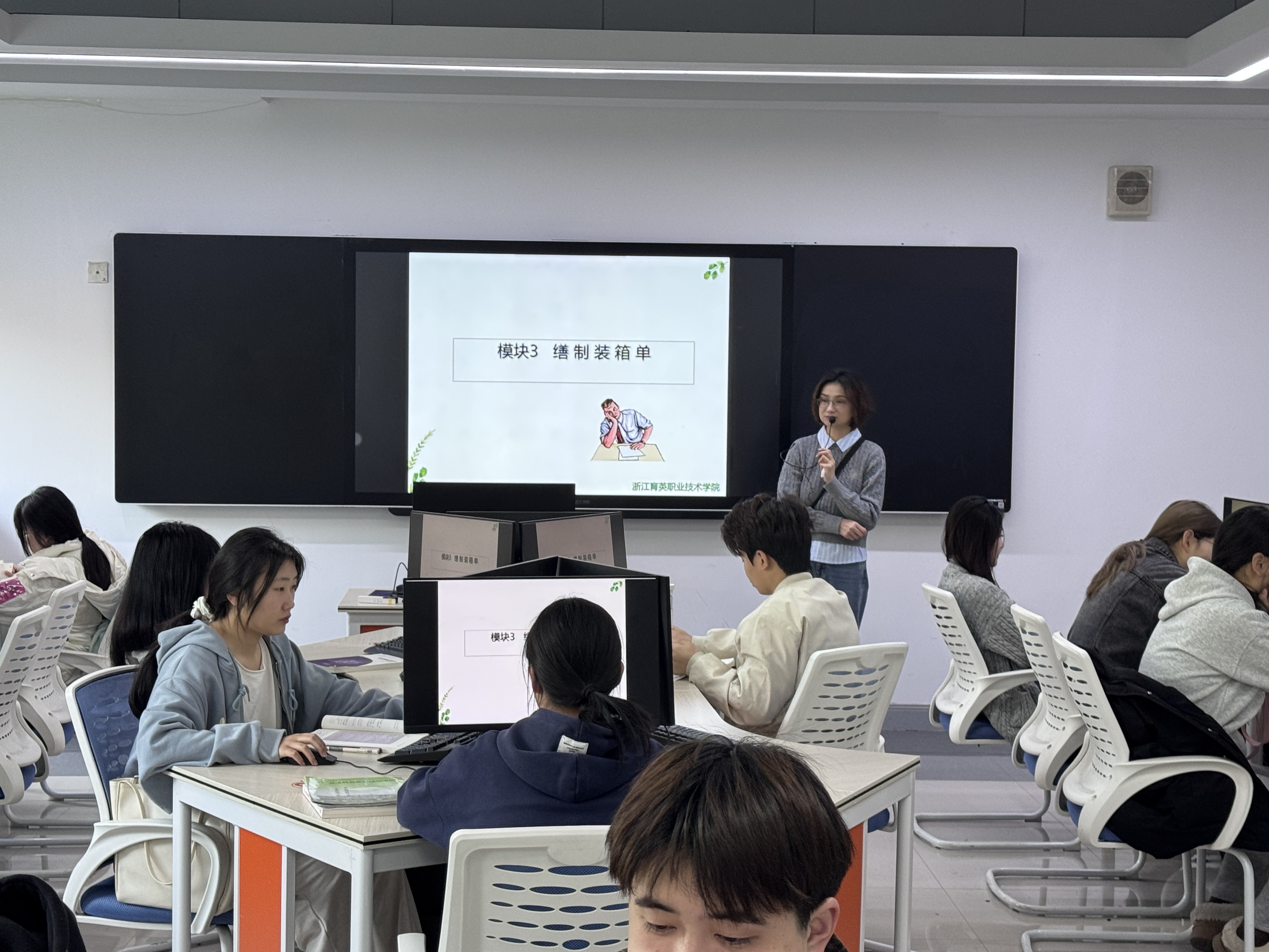 3 月 20 日,国际商务专业黄冬梅老师在 3120 实训室开展《单证制作实务》公开课。课堂聚焦 “装箱单缮制”工作流程,黄老师精心准备任务背景,以 “制单依据” 为核心,设计两个子任务。围绕包装单据内涵,剖析散装货、裸装货和包装货区别,结合实例强调不同货物在运输等环节注意事项,点明装箱单对贸易流程的重要性。同时,详细解读专业词汇,为学生扫除术语障碍。根据装箱单缮制技能要求,拆解装箱单首文缮制内容,通过板书演示与随堂练习,引导学生掌握缮制流程,针对易错点着重提示。