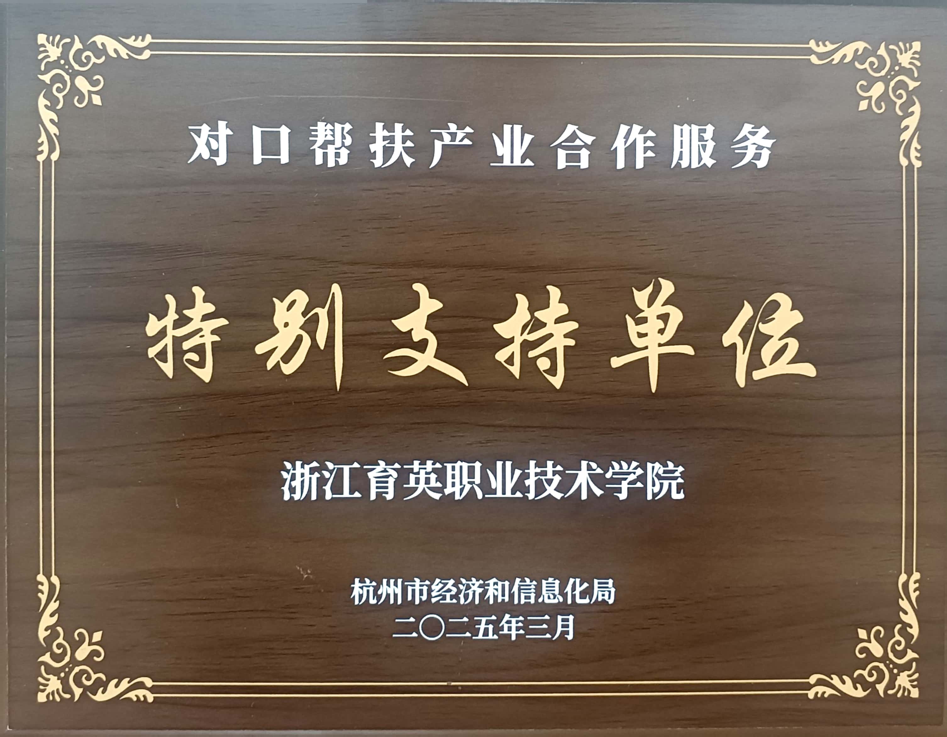 大会上,对积极落实国家对口帮扶战略,深化产业协作与社会责任实践工作中有突出贡献的协会单位与个人进行了表彰。经市场营销协会提名,报杭州市经济和信息化局同意,浙江育英职业技术学院被授予 “对口帮扶产业合作服务特别支持单位”称号,同时授予数智商贸学院党总支书记、院长欧阳驹“对口帮扶产业合作服务年度积极分子”称号。
