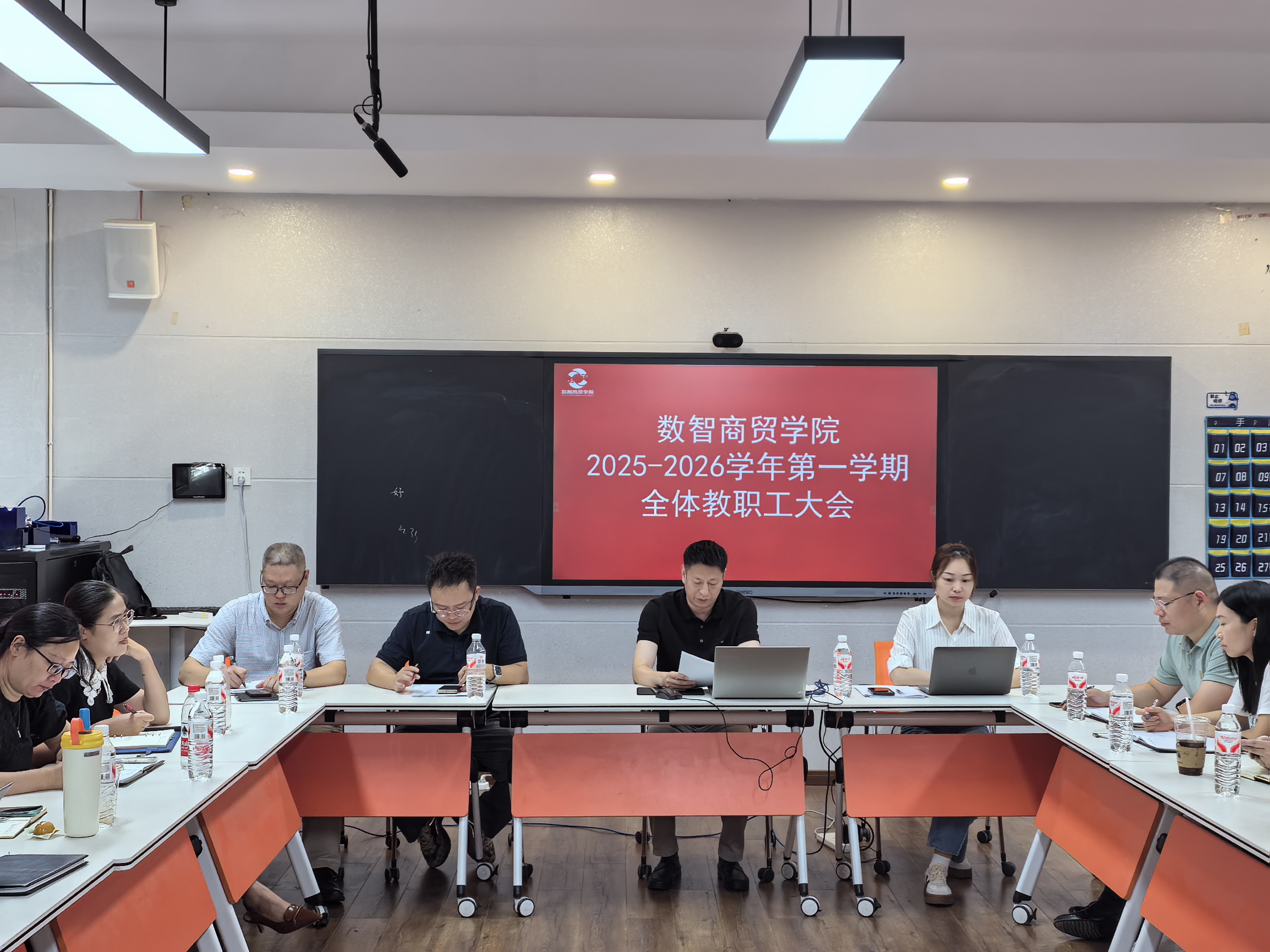 2025年9月6日下午,数智商贸学院新学期全体教职工会议在3213智慧教室召开。本次会议由学院党总支书记、院长欧阳驹主持,副院长章雁峰、吴有权、党总支副书记、院长助理孙钦及全体教职工参加。