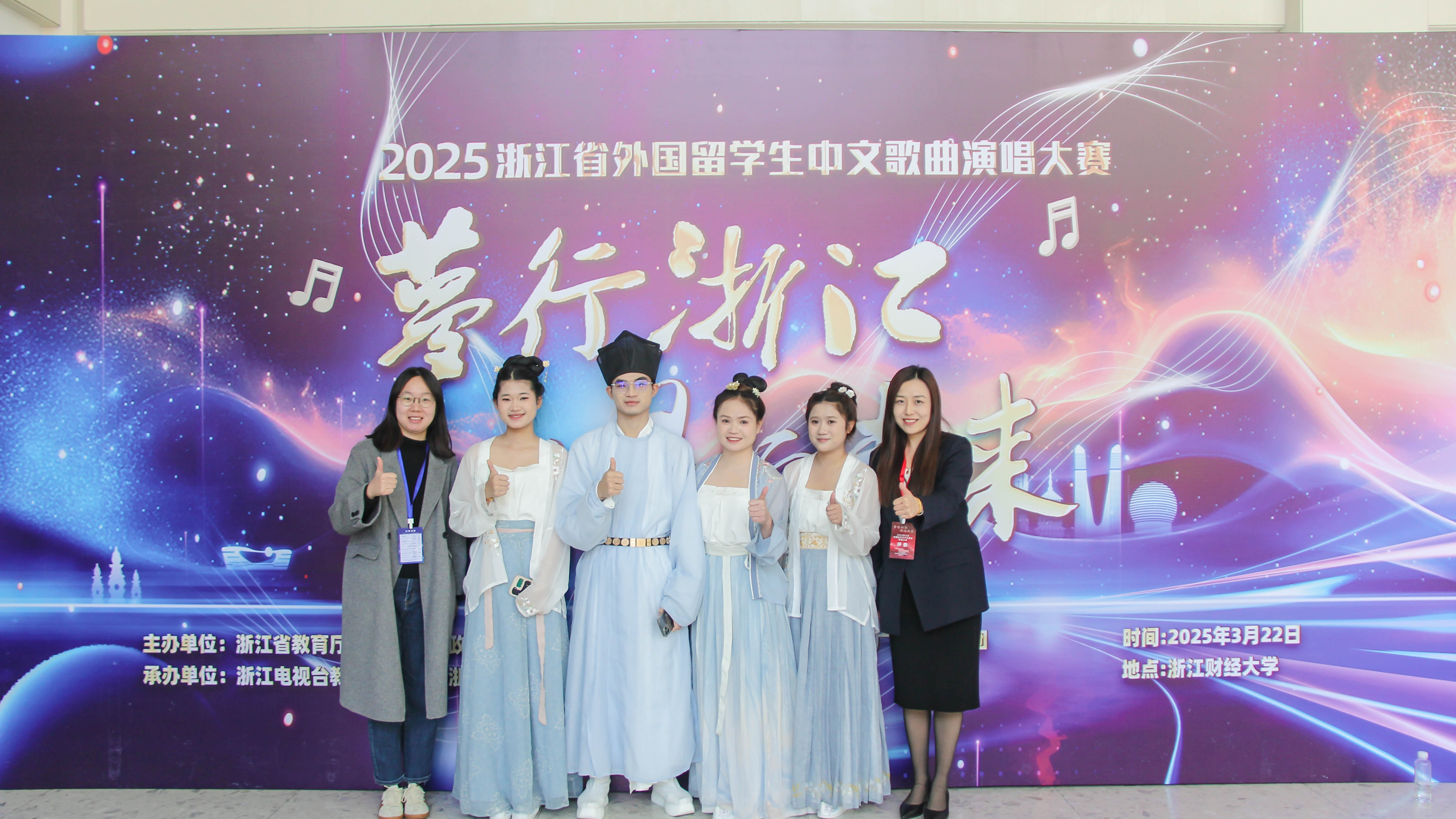 3月22日,由浙江省教育厅、省政府新闻办、省外事办、浙江广电集团主办,浙江教科影视频道与浙江财经大学承办的"梦行浙江·唱响未来"留学生中文歌曲大赛在浙江财经大学拉开帷幕。全省高校170支留学生队伍同台竞技,其中我院23级酒店(老挝班)通卡、安在欣、芳欣、娜飒枫身着宋制汉服,以一曲《声声慢》将江南韵味与异域风情交融,用歌声在四十余国青年间编织文化共鸣纽带。大赛通过音乐架起中外交流桥梁,展现留学生眼中多元文化交融的浙江魅力。