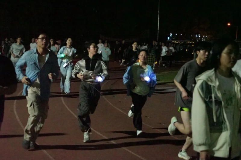 “来来来,都跟着我活动开!”社团管理中心副主任郑锦坚同学站在广场中央呼吁大家一起做跑前热身。同学们开心的跟着他一起高抬腿、原地跳,操场上翻涌起发光的波浪,在黑暗中晃成一片星海。