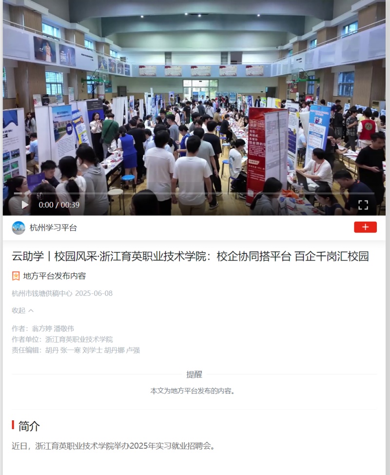 【学习强国】云助学丨校园风采·浙江育英职业技术学院:校企协同搭平台 百企千岗汇校园