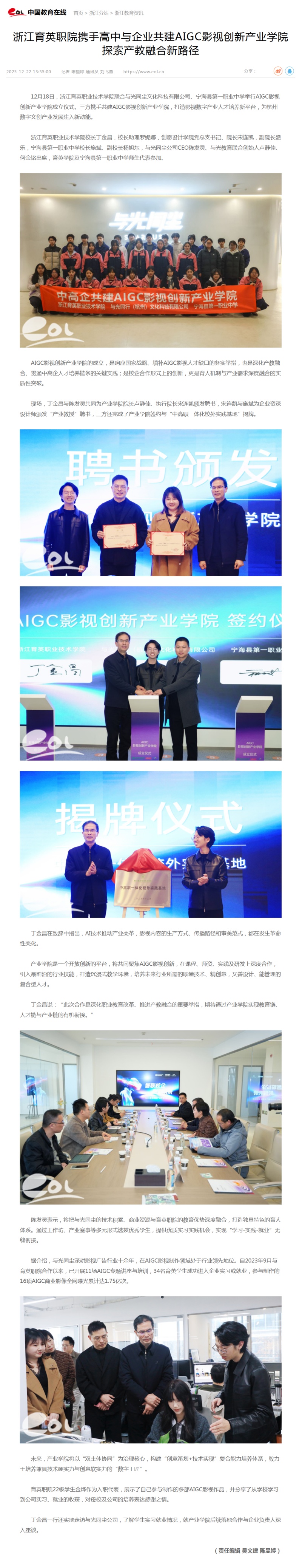12月18日,浙江育英职业技术学院联合与光同尘文化科技有限公司、宁海县第一职业中学举行AIGC影视创新产业学院成立仪式。三方携手共建AIGC影视创新产业学院,打造影视数字产业人才培养新平台,为杭州数字文创产业发展注入新动能。