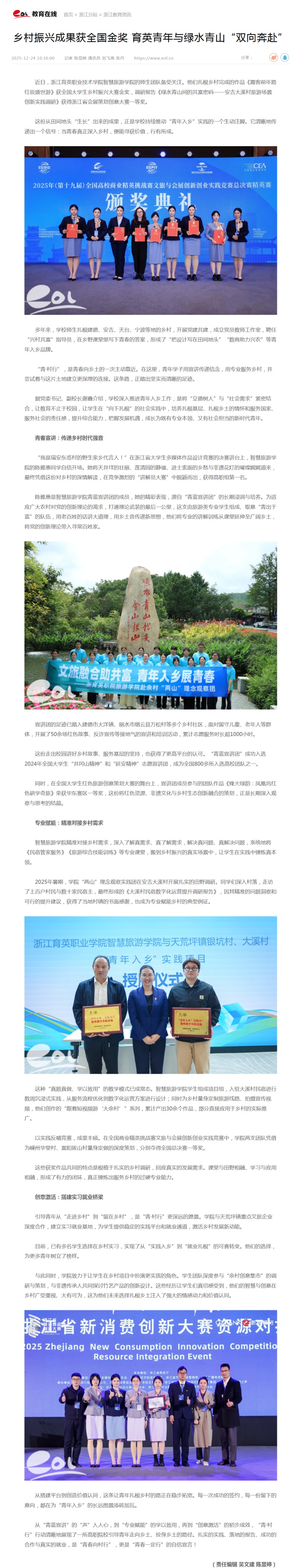 近日,浙江育英职业技术学院星空彩票体育app平台的师生团队备受关注。他们扎根乡村完成的作品《霞客前年路 红妆盛世游》获全国大学生乡村振兴大赛金奖,调研报告《绿水青山间的共富密码——安吉大溪村旅游场景创新实践调研》获得浙江省会展策划创意大赛一等奖。