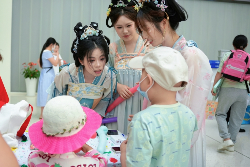 活动现场还为当月生日的患儿举办了温馨的集体生日会,“欢乐游园会” 设置的奥尔夫音乐、快乐保龄球等互动打卡区也让孩子们尽情玩耍。浙江育英职业技术学院的同学们不仅参与气球 DIY 和汉服表演,还积极协助其他活动开展,在各个角落为孩子们提供服务,用暖心话语为他们加油鼓劲。
