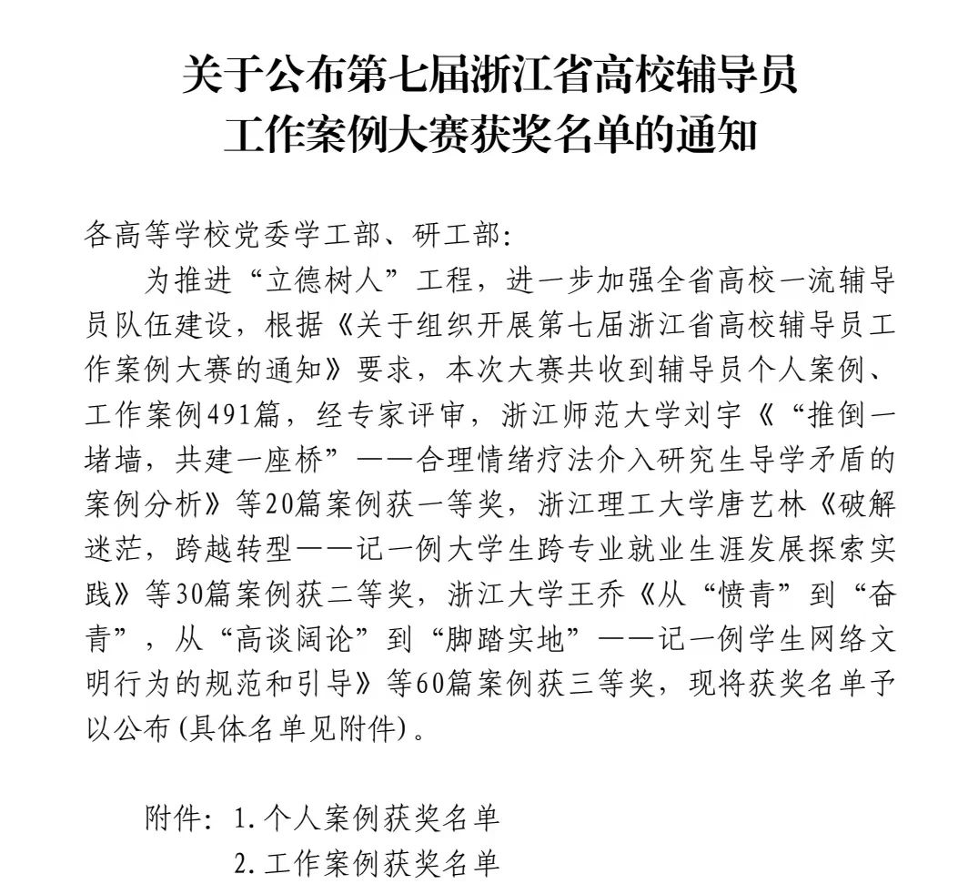 本届大赛由浙江省教育厅宣传教育与统战处、浙江省高等教育学会思想政治教育分会主办。大赛共收到全省辅导员个人案例、工作案例491篇。经专家评审,最终遴选出案例一等奖20篇、二等奖30篇、三等奖60篇。