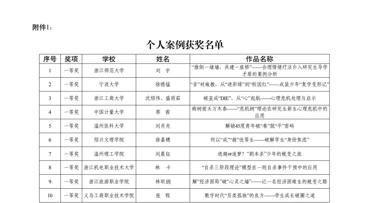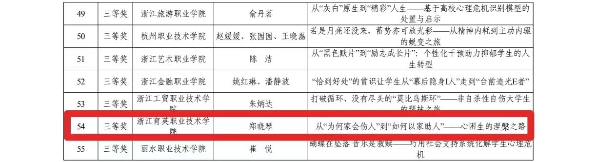 近日,第七届浙江省高校辅导员工作案例大赛评比结果揭晓,我校数字技术学院郑晓琴撰写的《从“为何家会伤人”到“如何以家助人”——心困生的涅槃之路》荣获个人案例三等奖,智慧旅游学院张丹、董文共同撰写的《“双向结对、六维联动、三链融合”留学生国情教育创新实践》获工作案例三等奖。