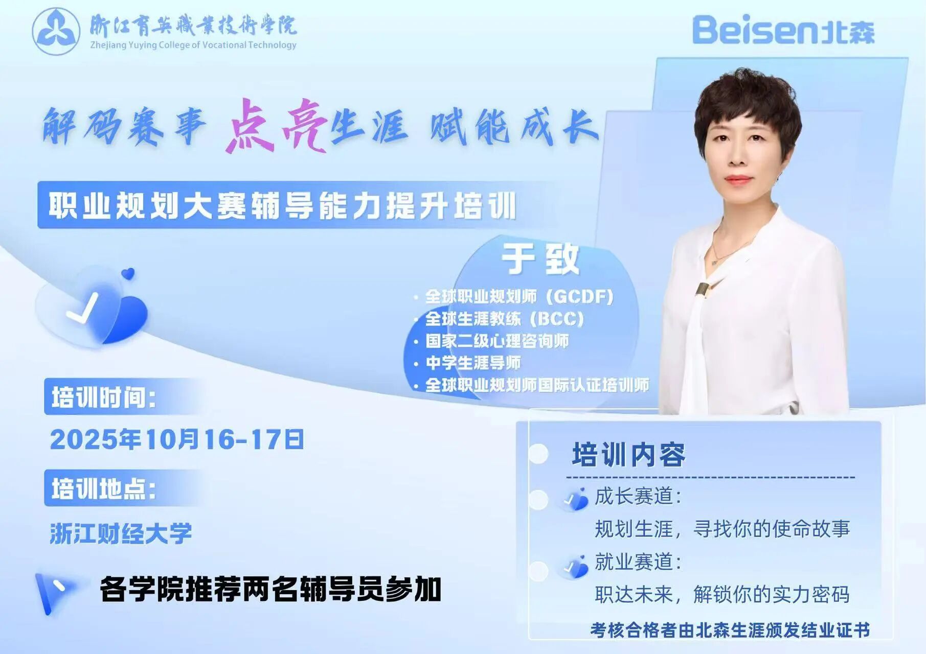 两天的培训干货满满,让我收获颇丰。系统的比赛框架梳理、实用的备赛方法论讲解,彻底颠覆了我对职规赛的固有认知。尤其是优秀作品解析环节,通过案例拆解直击创作核心,帮助我理清了思路、找准了方向。这场培训不仅提升了我的备赛指导能力,更让我深刻体会到职业规划的逻辑深度与现实意义,为接下来的赛事指导打下了坚实基础。