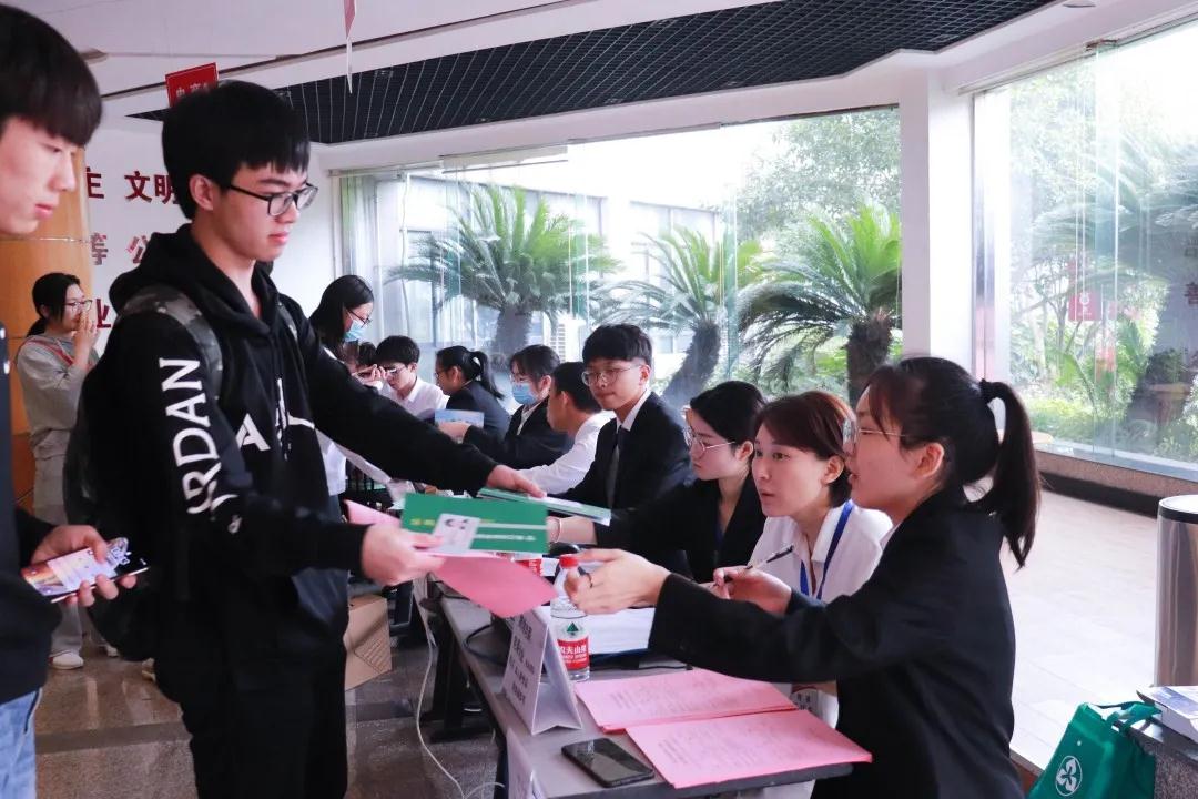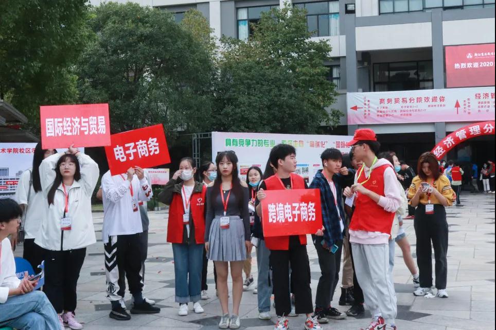 志愿者们在校门口竖着牌子迎接商贸分院的小二十们。主动上前把他们带到报到大厅,还会给新生们一些生活上的小建议。