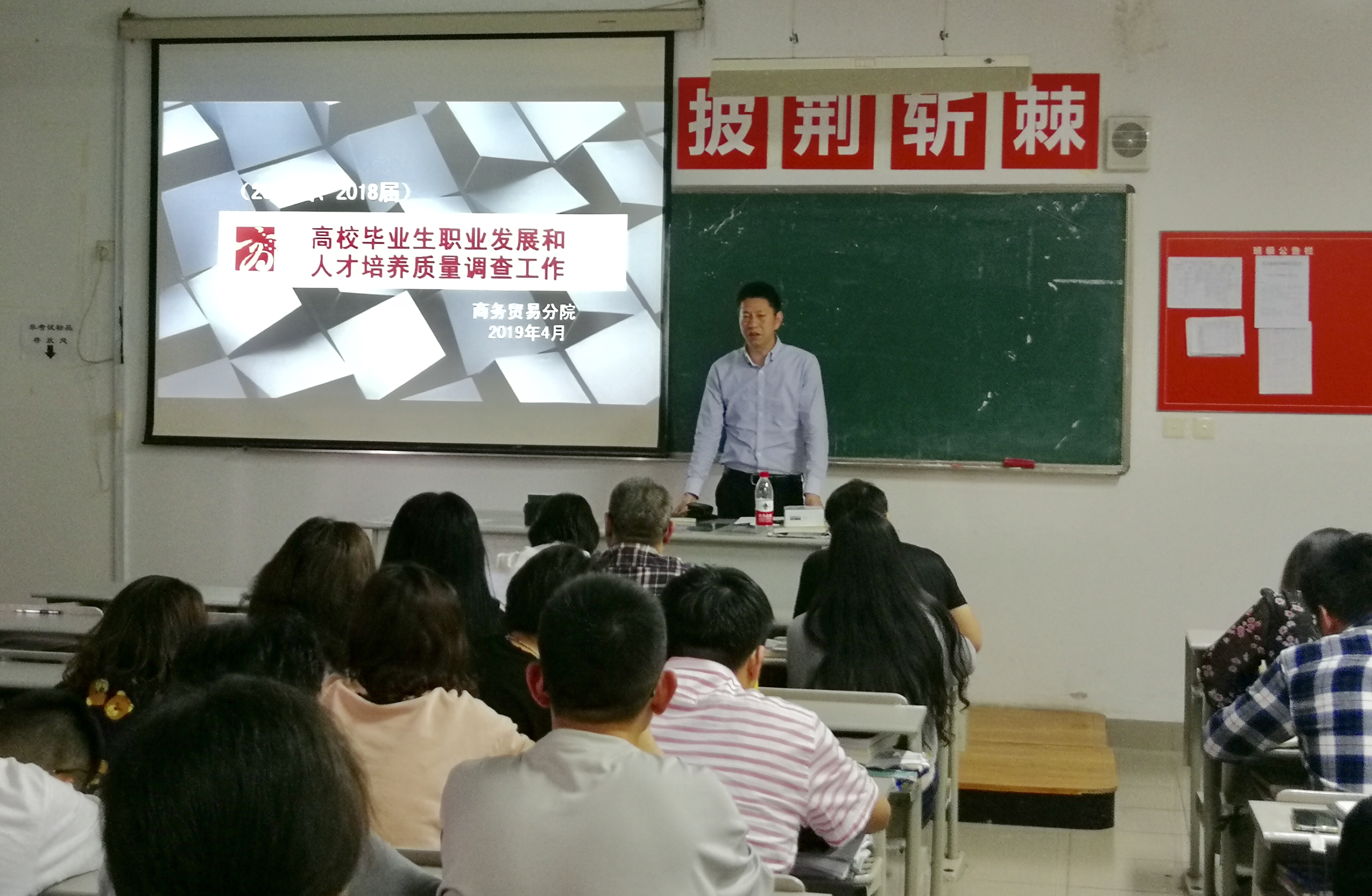 为了确保2016届、2018届毕业生职业发展状况和人才培养质量调查工作顺利进行和目标任务的完成。2019年4月23日12点40分,商务贸易分院在3324教室召开毕业生跟踪调查的动员会。分院全体领导、各教研室主任、副主任、负责班级和企业调查的全体老师参加此次会议。商贸分院涉及到本次调查的27个班级,其中2016届11个班级,2018届16个班级,共计1197名毕业生。