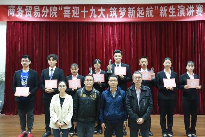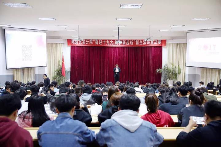 2017年11月8日18:30,商务贸易分院“喜迎十九大,筑梦新起航”演讲赛决赛在学院一号报告厅举行,受邀的评委有王贤军老师,王彤老师,丁月明老师以及陈倩学姐。受邀嘉宾有陈钢老师,沈文青老师,葛佩瑶老师,周丽莎老师,张竹婷老师以及颜芹芹老师。17级相关班级同学参加观看了本次比赛。