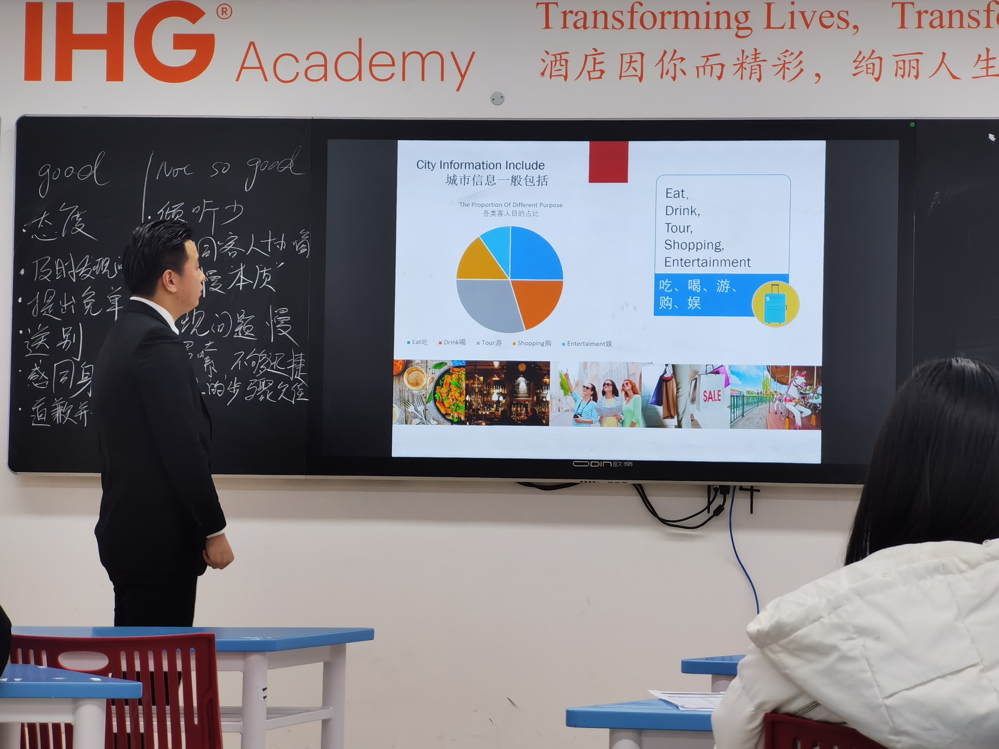 12月15日由餐饮部管理培训生Christina Zhu,也是我们19届毕业生朱静雯前来给学弟学妹们上了一堂以“酒店餐厅使用英语场景对话”为主题的课程。12月18日由中餐厅副经理Ellianco Yi给同学们就“酒店餐厅问题处理情景英语”为主题,通过了解问题或投诉的细节,问题处理,找到解决方案的细节。通过视频案例,讲述了问题的处理方法,并设小组讨论,派代表发言。同学们都能积极参与讨论、响应。另由礼宾司Yaphets Xu给同学们介绍了洲际特色礼宾。向同学们介绍了杭州的天气、区位、酒店的周边,还有交通的限行政策、旅游景点、杭帮菜的介绍、杭州特产等等,让同学们了解到了“无所不能”的金钥匙——礼宾司们的日常必备知识。