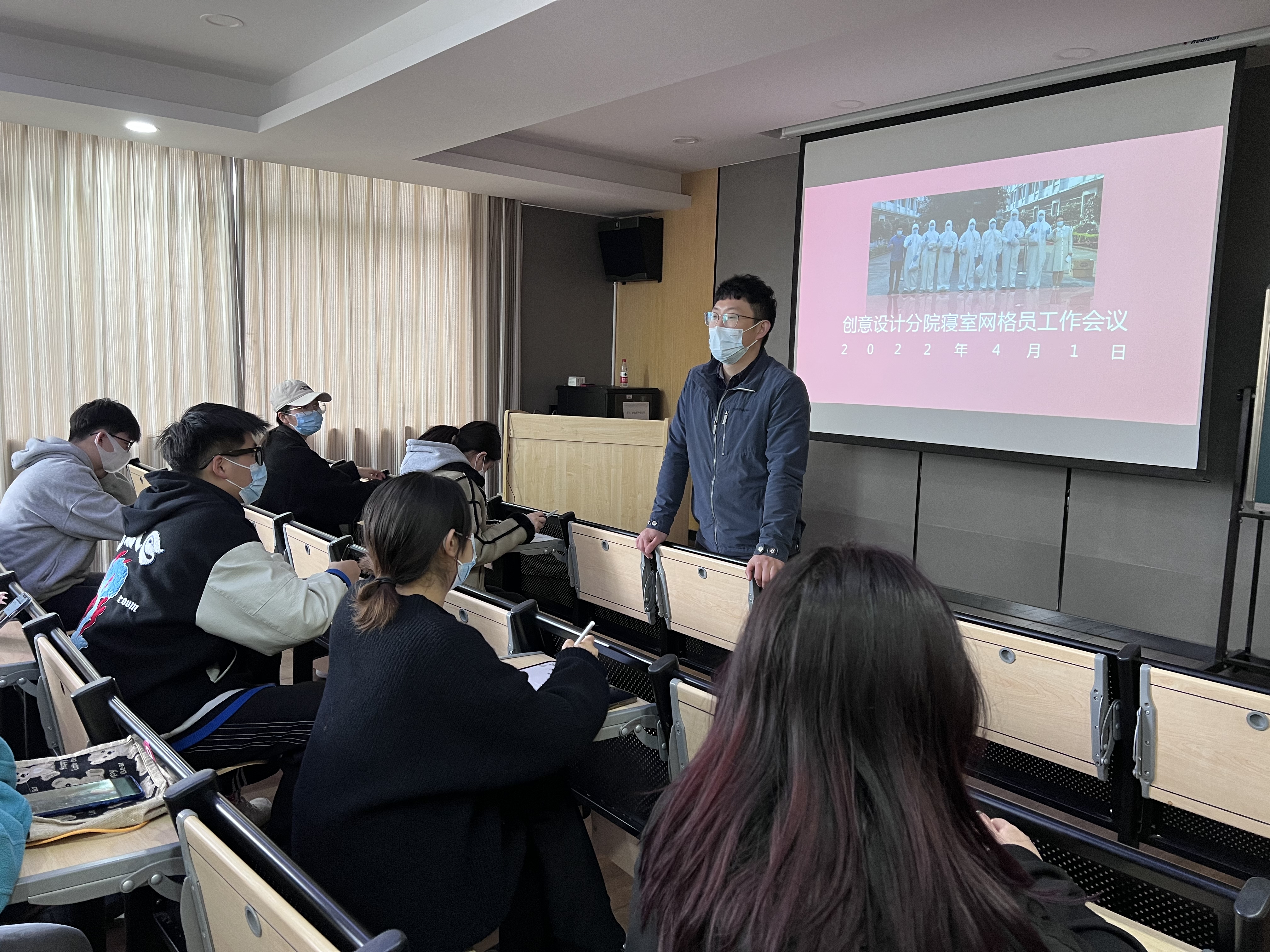 4月1日,创意设计分院寝室网格员工作会议在创意中心视听室召开,因疫情防控需要,此次会议分中午和晚上两场召开,100余名寝室网格员参与了此次会议,会议分别由分院党总支书记张丹、学工秘书周亮主持。